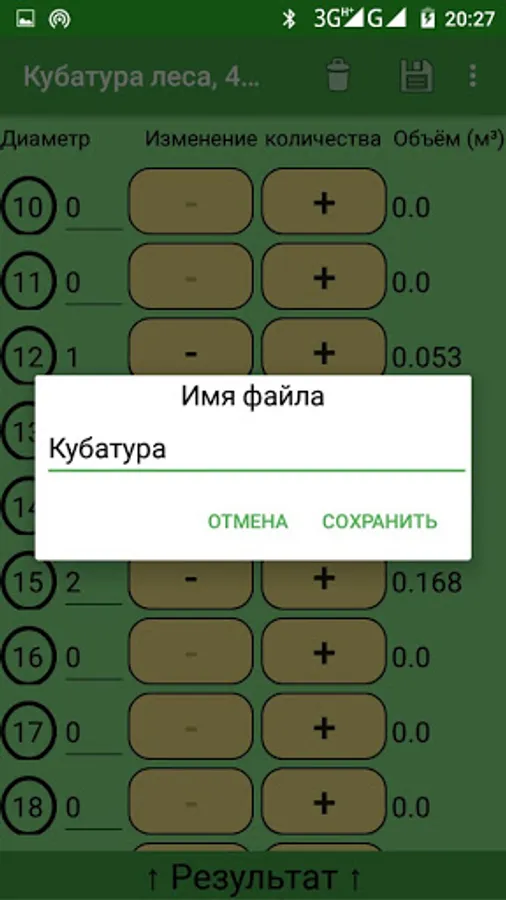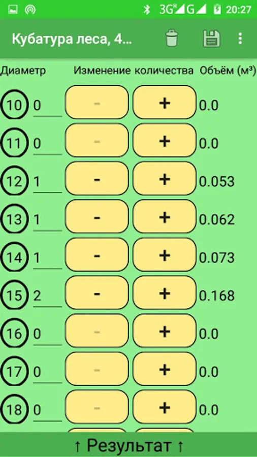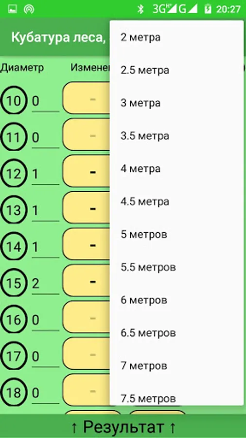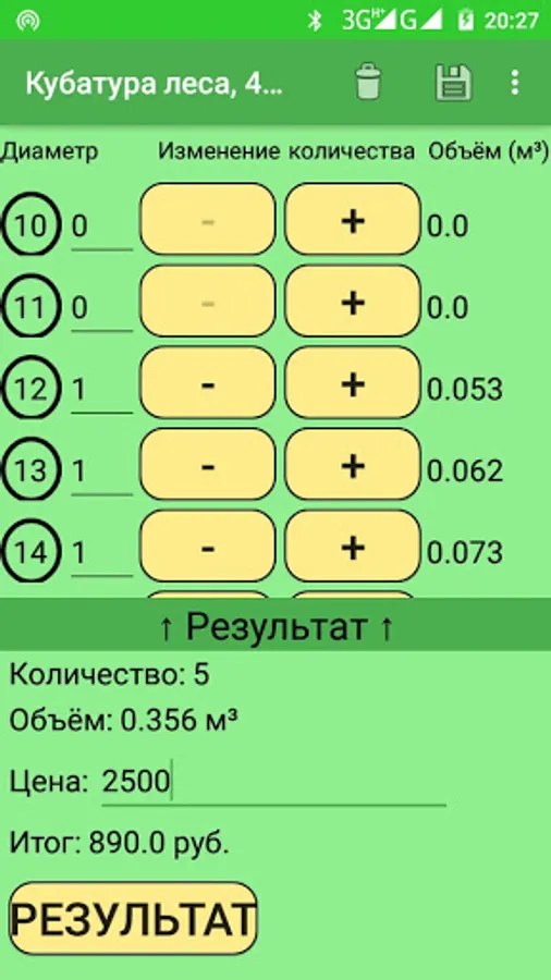 Roundwood cubic capacity application, very convenient and easy to use, the number of logs can be entered from the keyboard, which makes the work easier and faster. It can be considered logs with a diameter of 10 to 90 cm., Of different lengths (from 1 meter to 9, with an interval of 0.5 meters). You can also enter the cost of one cubic meter and the application will calculate the price for the forest itself.
