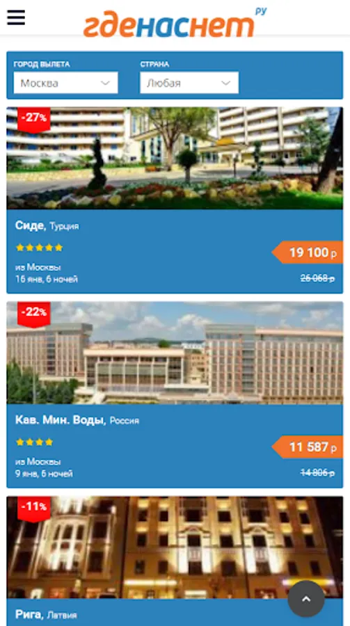 The application always shows the best prices from 86 tour operators. Search tours from Tez Tour, Pegasus Tourist, Coral Travel, Anex Tour, Biblio Globus, TUI, Intourist, Mouzenidis Travel, Pak Group, Sanmar Tour - all the top operators in one place! Full information about tours in the application will help you choose the best and please yourself and your family with quality holidays at a reasonable price. We offer last-minute tours to Turkey, Russia, Greece, Spain, tours to Tunisia, Cyprus, Croatia, tours to Morocco and the UAE, holidays in Thailand, tours to Israel, Andorra, Bali and Seychelles, tours to China, Mexico, Dominican Republic, Goa, Austria, Vietnam, tours to the Maldives. Huge selection of tours and great prices!