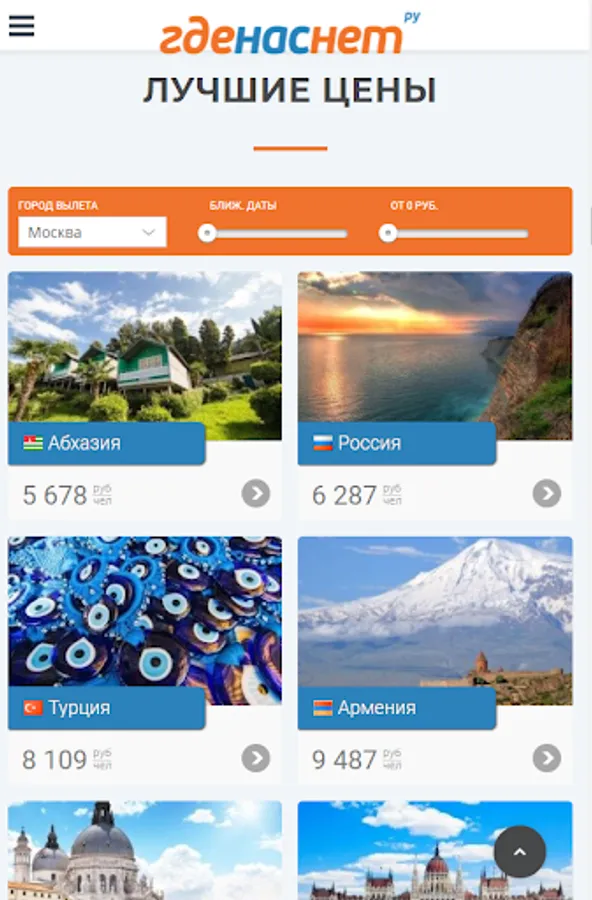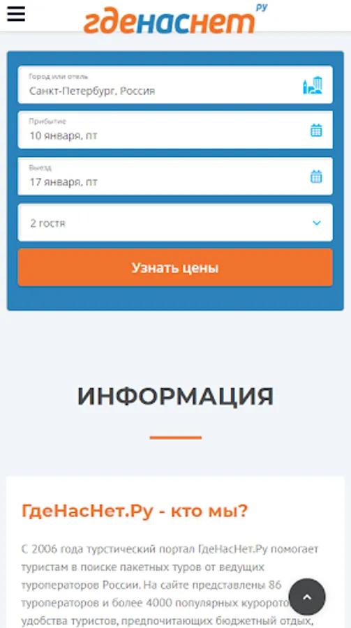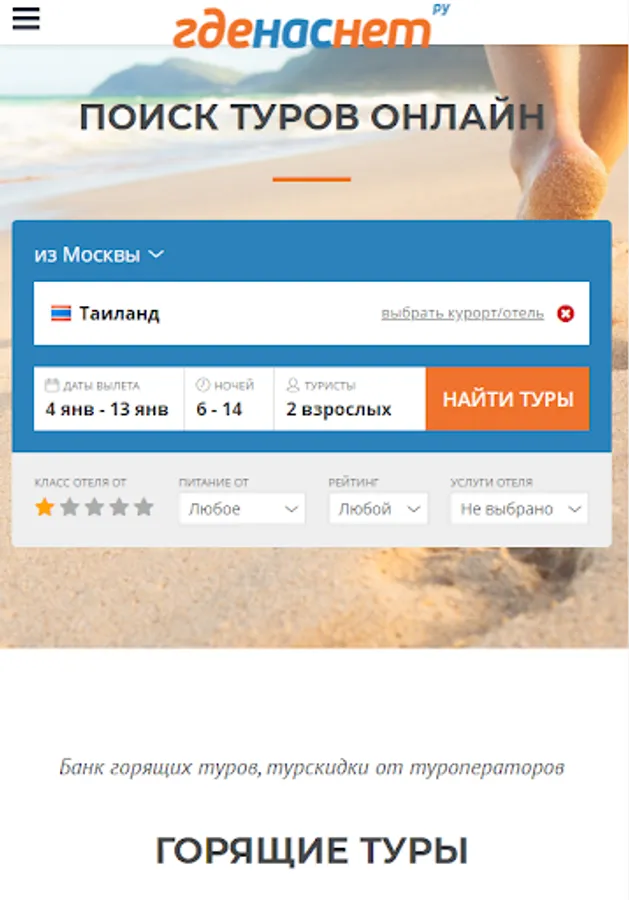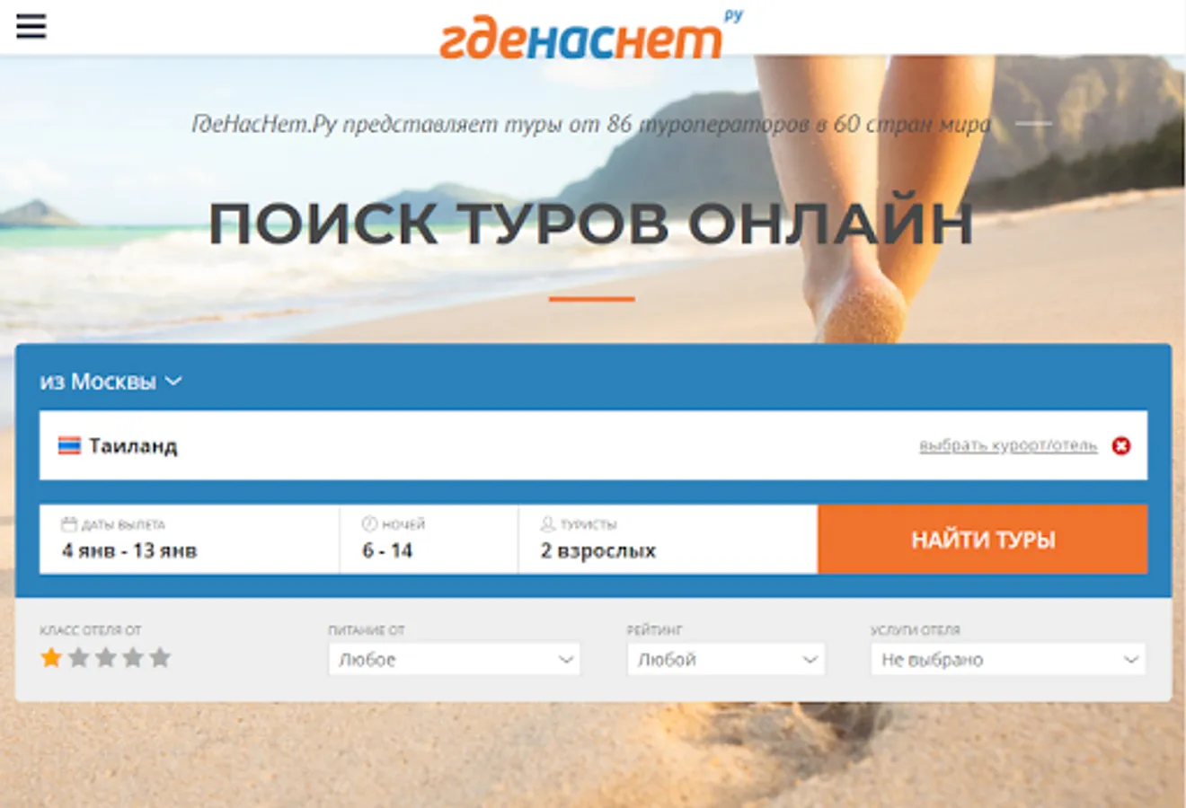 Since 2006, the tourist project WhereNasNet.Ru has been helping tourists in finding package tours from leading tour operators in Russia. The project includes 86 tour operators and more than 4000 popular resorts. For the convenience of tourists who prefer a budget vacation, we have provided a separate section with last-minute tours to all mass destinations. All last minute packages are displayed with specific travel discounts and an indication of the tour operators who offer them. The bank of last-minute tours is updated online. In order to plan a trip for a longer time or to find out about the "Previously booking from tour operators" promotions, use the "Minimum Price Calendar" section with the option of choosing the optimal cost of tours for months and countries. Any chosen tour can be paid by credit card without getting up off the couch. Just send a request for a tour and our specialists after checking the relevance will send you a link to online payment. Documents (for visa-free countries) you receive by e-mail before departure.