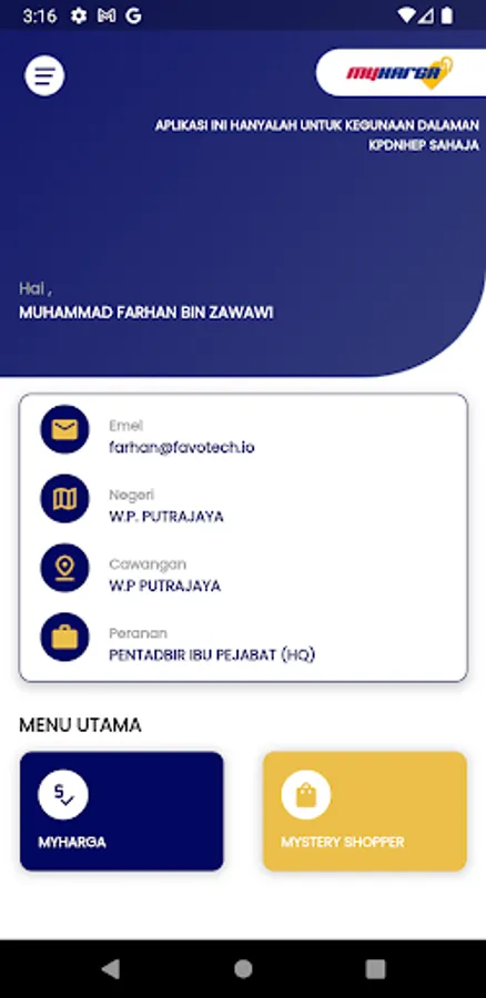 As part of the system, this MyHarga app allows our officers to easily collect and monitor the prices right from their mobile phones and smart devices. The offices just need to login, select the premise and item list type and straightaway enter the current prices of the items and the app will store and sync them with the KPDN server using mobile data or wifi.