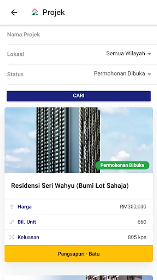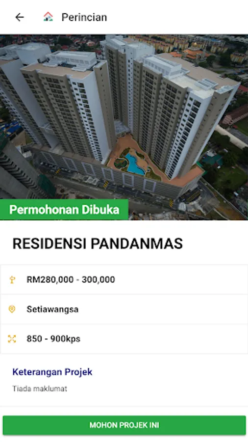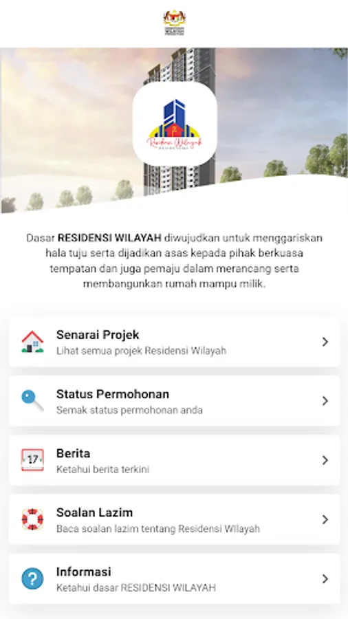Residensi Wilayah Mobile App is developed to facilitate users to view the list of Residensi Wilayah projects and subsequently apply for the project. Users can also check their application status through the app.