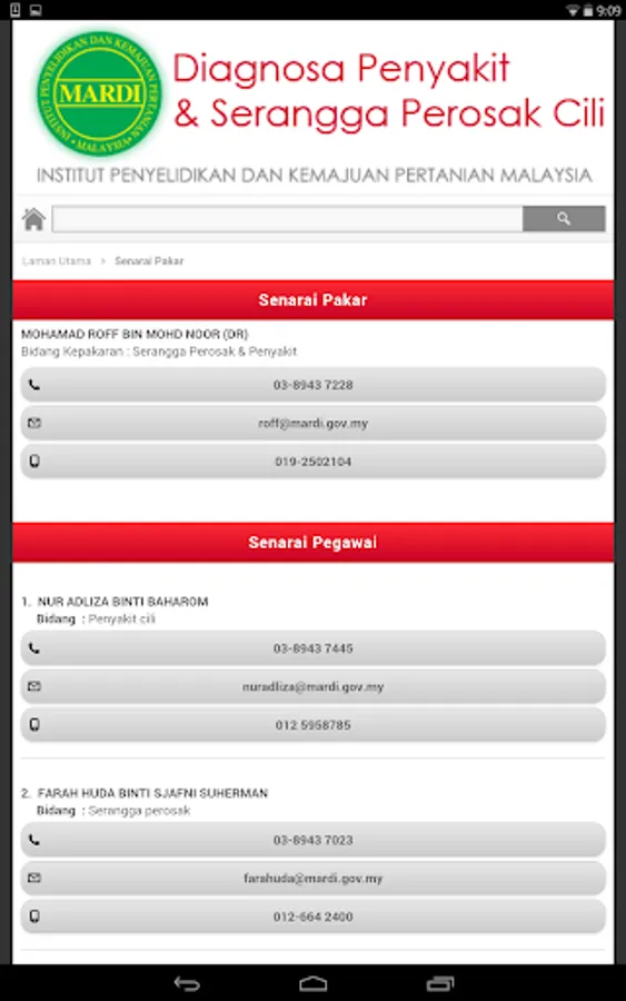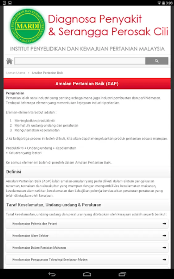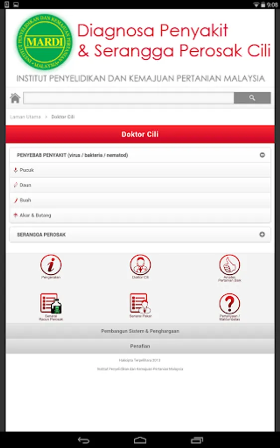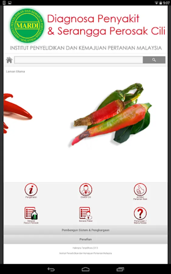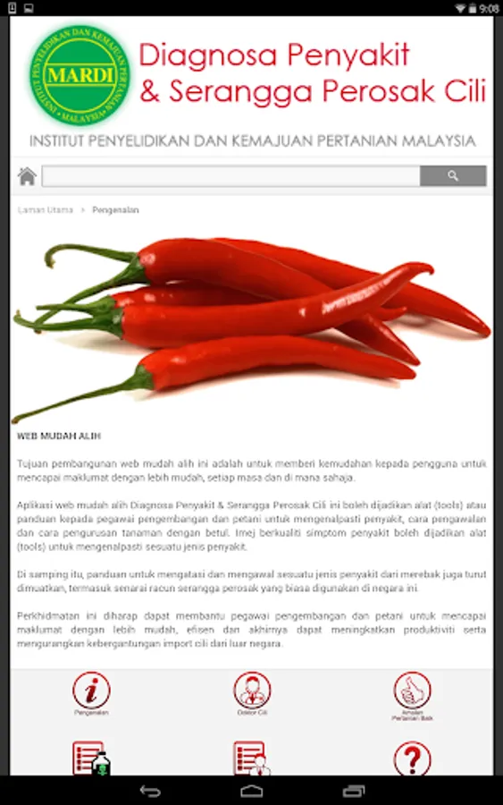 Aplikasi mudah alih Diagnosa Penyakit dan Serangga Perosak Cili dan juga panduan kepada pengguna untuk mengenalpasti penyakit, cara pengawalan dan cara pengurusan tanaman dengan betul. Imej berkualiti simtom penyakit boleh dijadikan alat untuk mengenalpasti sesuatu jenis penyakit.