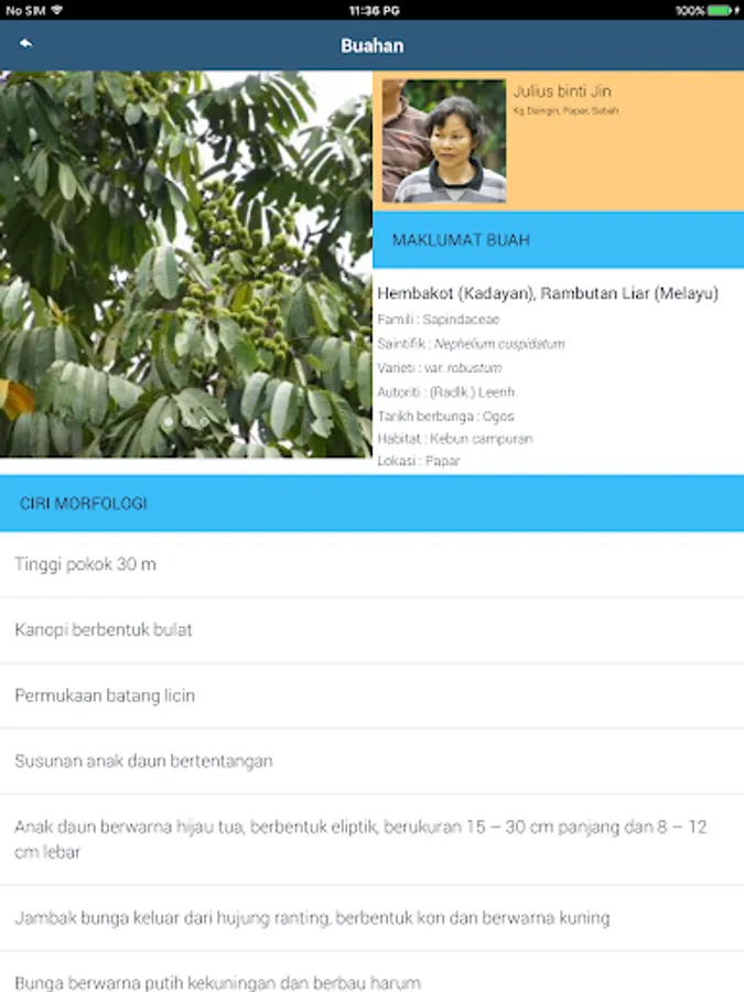 Aplikasi ini telah dibangunkan berdasarkan maklumat pencirian dan penilaian spesies buah-buahan daripada tiga genus iaitu Mangifera (mangga), Nephelium (rambutan) dan Garcinia (manggis) yang terdapat di halaman rumah atau kebun petani di enam kawasan yang terlibat. Maklumat yang dipaparkan adalah seperti data pasport, data morfologi pokok dan buah yang direkod oleh petani-petani dibantu oleh MARDI dan Jabatan Pertanian. Kegunaan dan pengetahuan tradisional serta gambar-gambar bagi spesies pokok buah-buahan tersebut juga direkodkan.