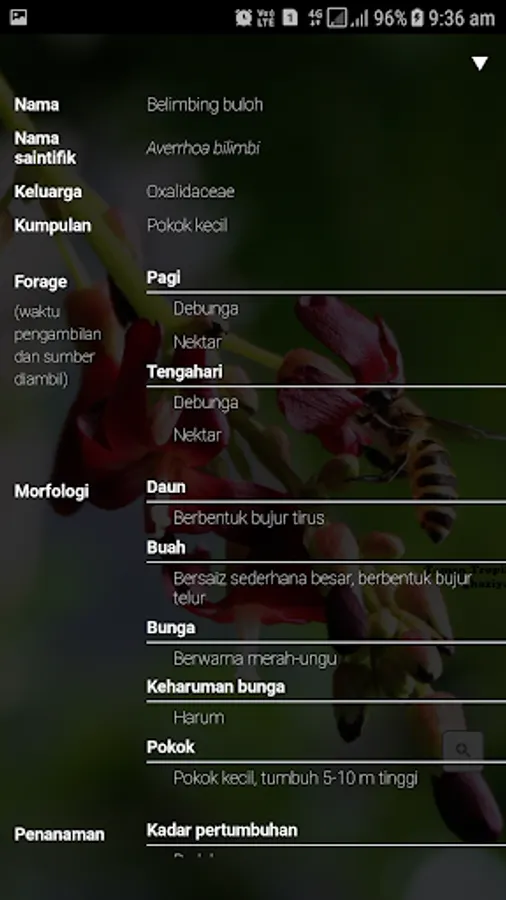 Aplikasi mudah alih yang mempunyai pangkalan data berkaitan pokok dan tumbuhan yang menjadi sumber makanan kepada lebah kelulut. Maklumat yang dikumpul ialah jenis tumbuhan, nama tumbuhan, keluarga, kumpulan, morfologi tumbuhan, maklumat penanaman, sumber dan waktu makanan diambil. Pangkalan data ini juga akan disertakan dengan imeg/gambar tumbuhan. Aplikasi yang dibangunkan ini dipercayai dapat membantu penternak atau bakal penternak mengenali tumbuhan atau pokok yang sesuai untuk menjadi sumber makanan lebah kelulut dan seterusnya dapat membantu lebah kelulut yang diternak menghasilkan madu yang baik.
