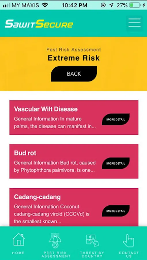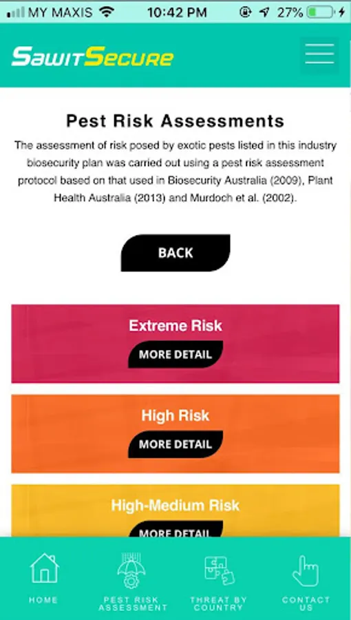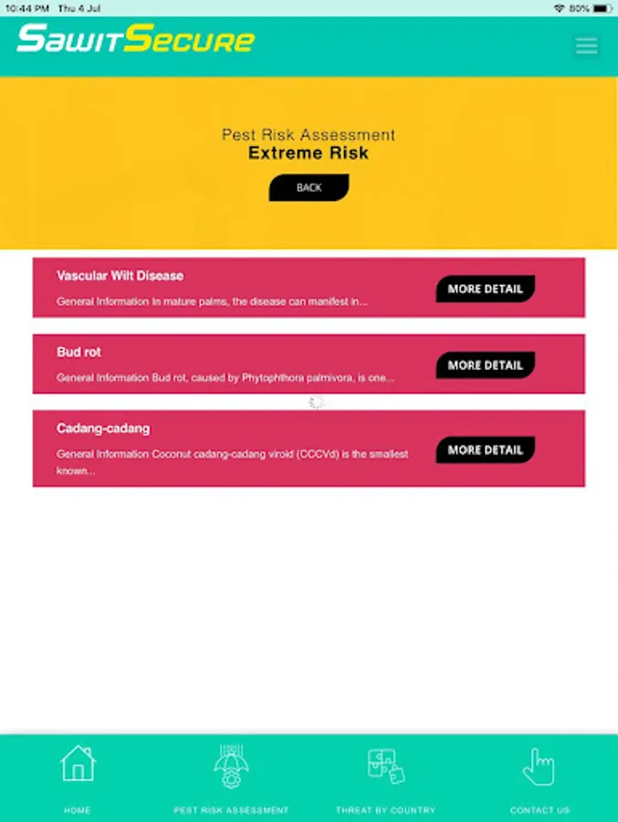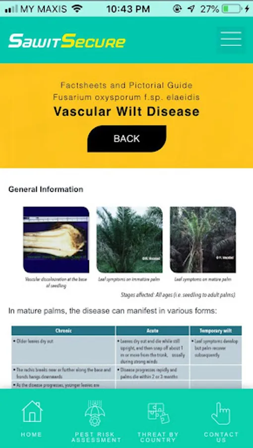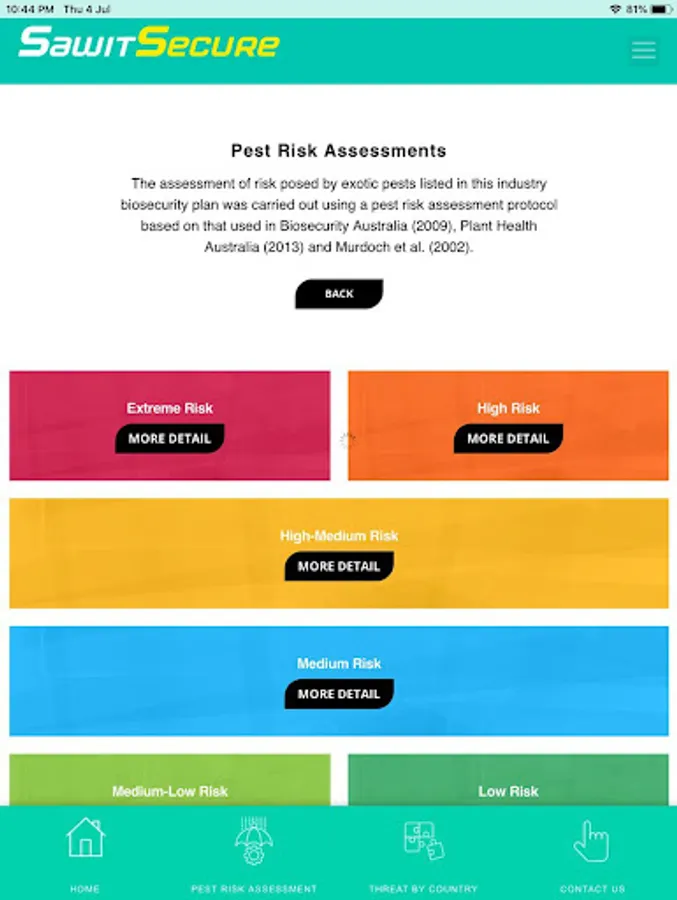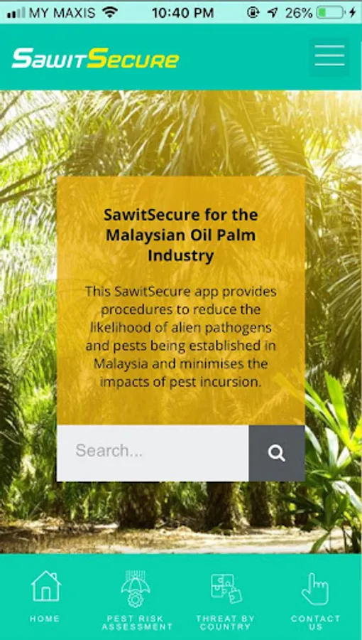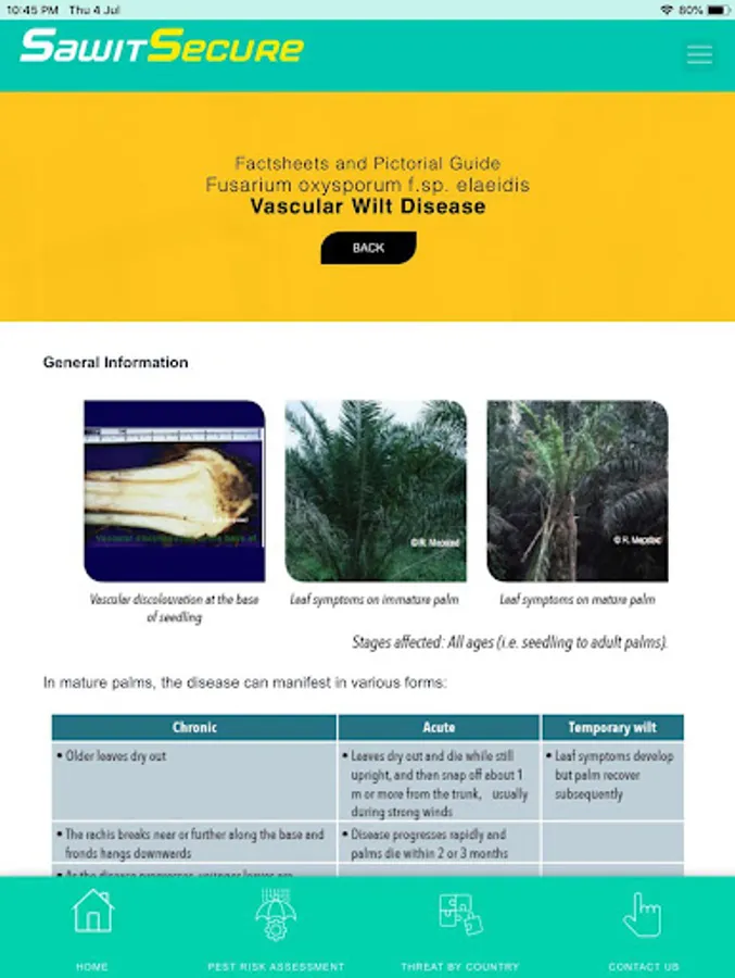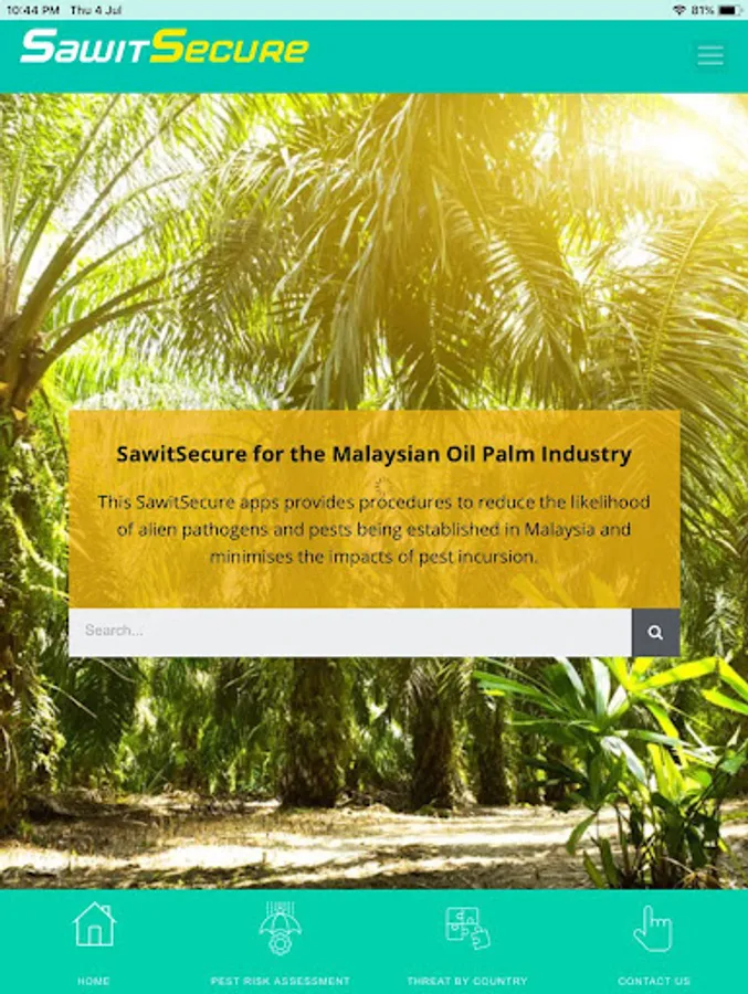 This SawitSecure app provides procedures to reduce the likehood of alien pathogens and pests being established in Malaysia and minimises the impacts of pest incursion