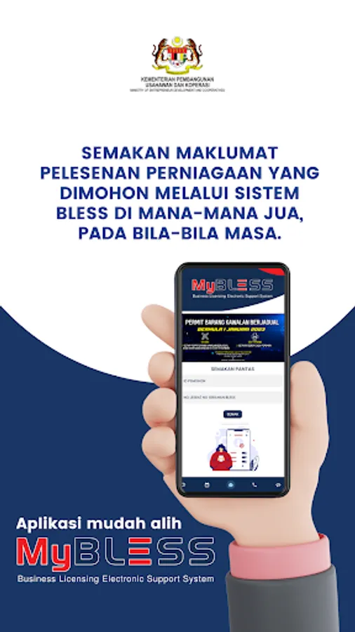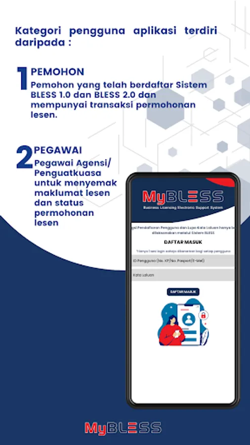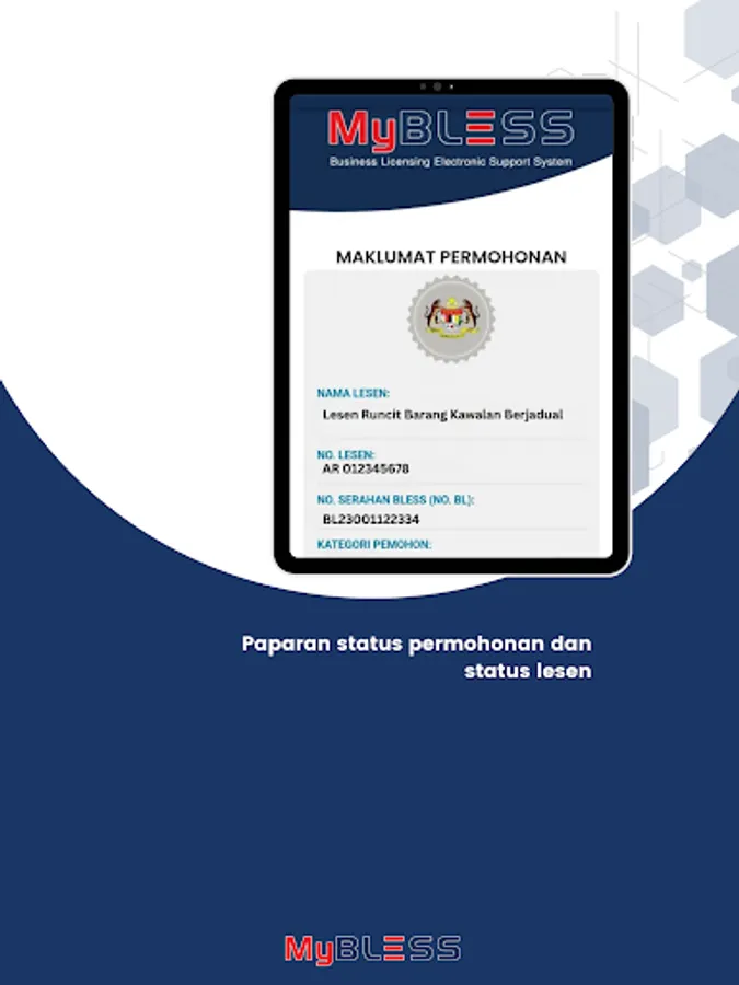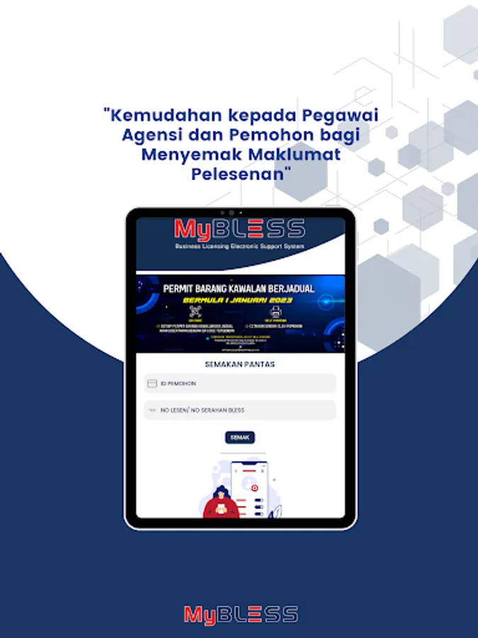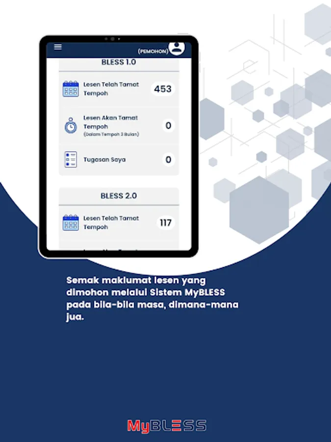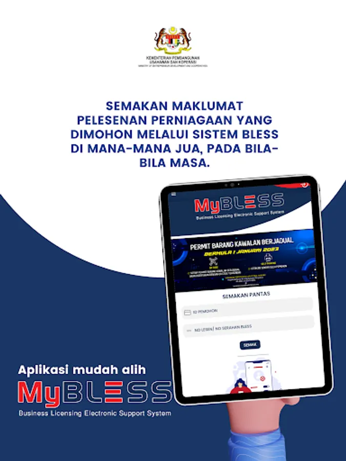 The MyBLESS application is an application developed by the BLESS Division, Ministry of Entrepreneur and Cooperative Development (MEDAC) which provides facilities to users from the business community and Licensing Authority agency officers to check license application information and license status.