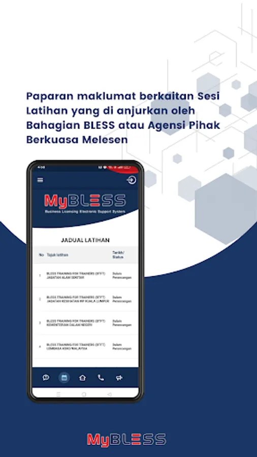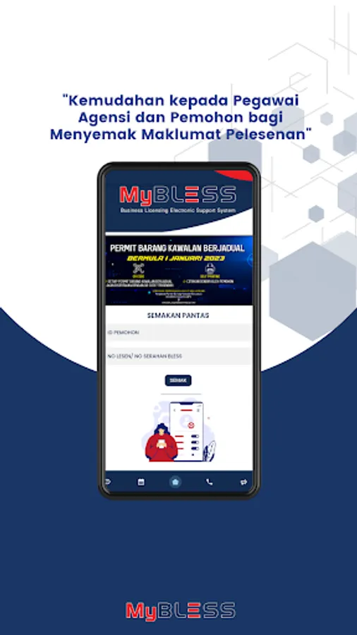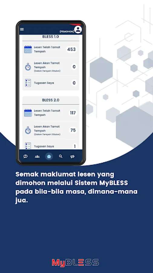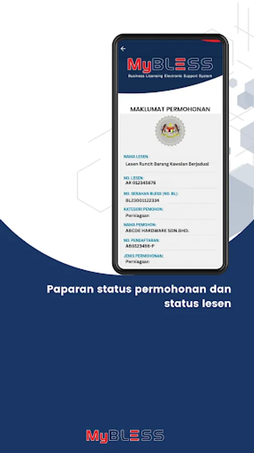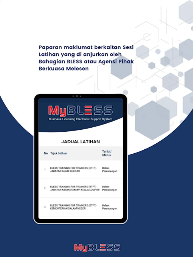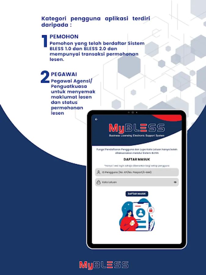 The MyBLESS application is an application developed by the BLESS Division, Ministry of Entrepreneur and Cooperative Development (MEDAC) which provides facilities to users from the business community and Licensing Authority agency officers to check license application information and license status.