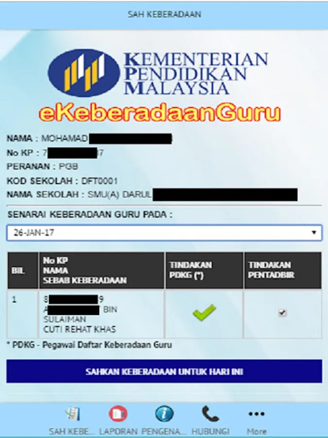 Fungsi utama aplikasi mudah alih ini merupakan sebahagian dari fungsi Sub Modul Keberadaan Guru (eOperasi) iaitu Pengesahan Keberadaan Guru.