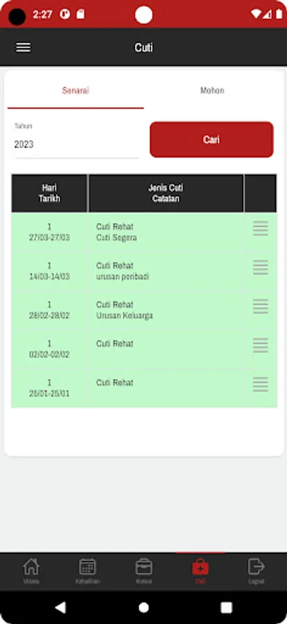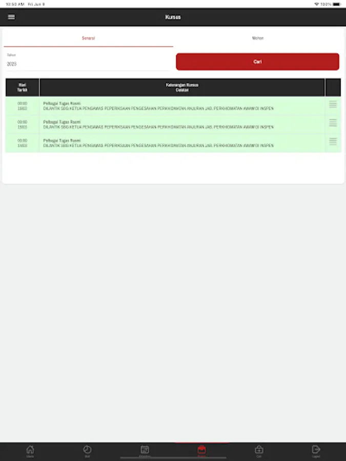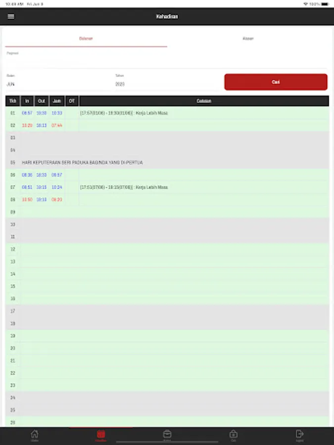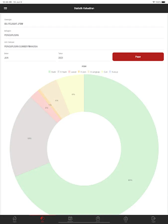 JBPM eAttendance is an attendance system for JBPM residents who work in the JBPM Headquarters building only. It was developed to replace the use of time recorder cards as attendance records. The system can be accessed through a website and also a mobile phone application. This system records attendance, courses and also leave of officers and staff. The presence of officers and staff will be recorded using a device that can scan faces or thumbprints. This tool is installed on Level B1 and Level G, JBPM Headquarters. This system can also print attendance reports according to categories such as Attendance Statistics, Monthly Attendance, Attendance Summary, Course Statistics, Attendance Analysis and others according to Division. This system is regulated by the Administration Branch to monitor the attendance of JBPM citizens.