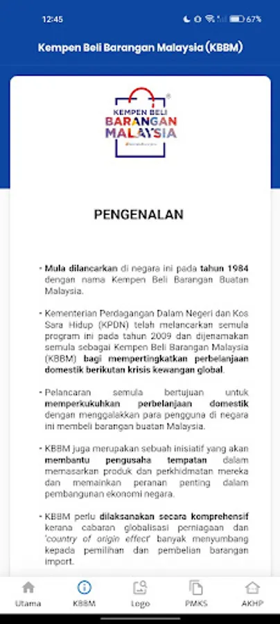 Developed by the Business Development Division, Ministry of Domestic Trade and Cost of Living (KPDN). This application also highlights the initiatives of KPDN in helping businesses especially Micro, Small and Medium Enterprises (PMKS) under the guidance of KPDN in penetrating the retail market as well as marking the Malaysian Goods Logo where business entities can register and submit applications for the marking of the Malaysian Goods Logo. The KBBM portal also functions as a one stop center for the public to get information related to consumerism such as the Fair Price Shop Award and the Franchise industry.