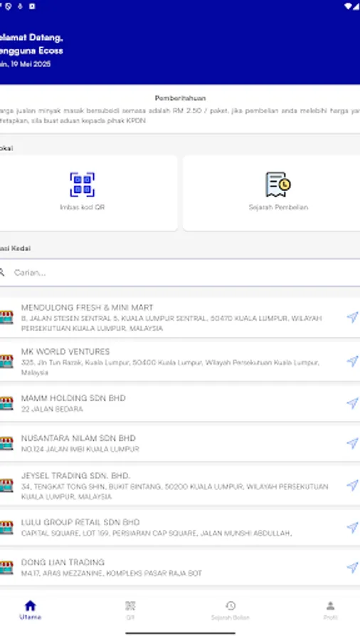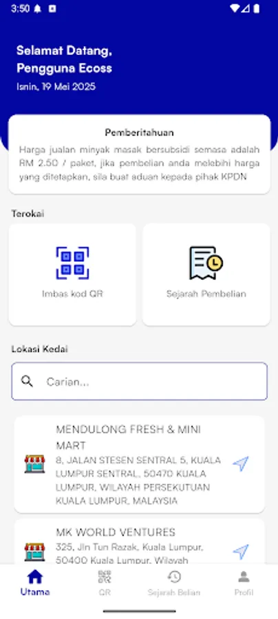The eCOSS mobile application is part of the eCOSS system which functions to record all sales transactions of subsidized 1kg packets of cooking oil from manufacturers, packers, wholesalers to purchase transactions from buyers at the retailer level.