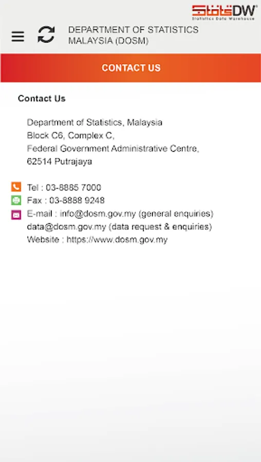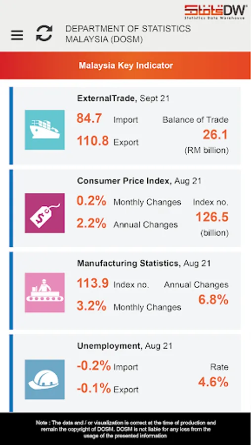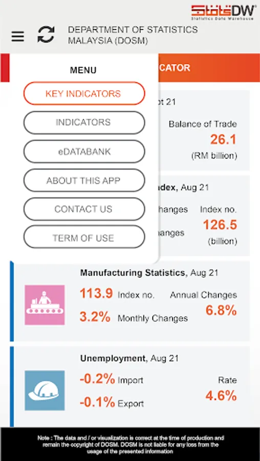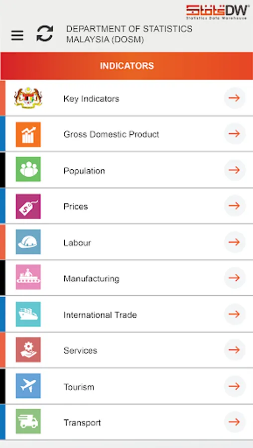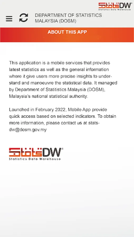 A mobile service application that displays the latest statistics while giving users a more accurate view to understand and move statistical data. It is managed by the Department of Statistics Malaysia (DOSM), Malaysia's national statistical authority. Launched in February 2022, the StatsDW 2.0 Mobile App provides quick access based on selected indicators.