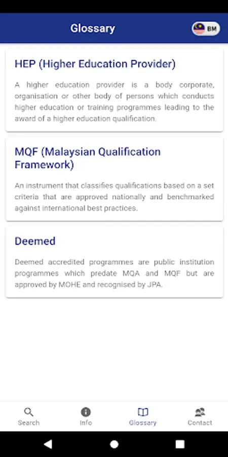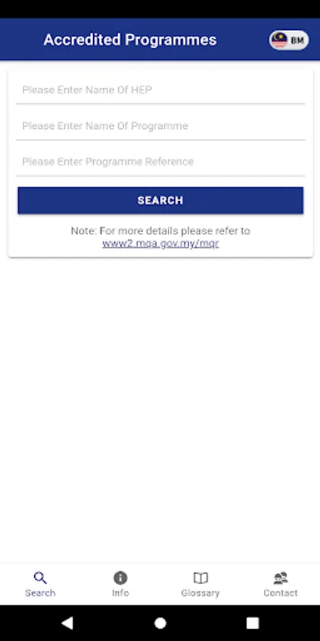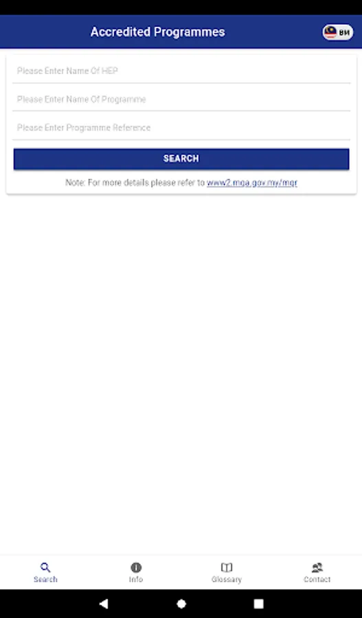 - Memudahkan orang awam membuat Semakan Program Akreditasi Penuh menerusi telefon pintar, di mana sahaja dan pada bila-bila masa; sebagai alternatif kepada Portal MQR yang sedia ada.