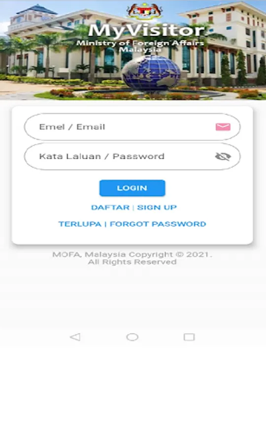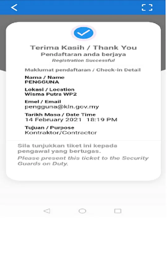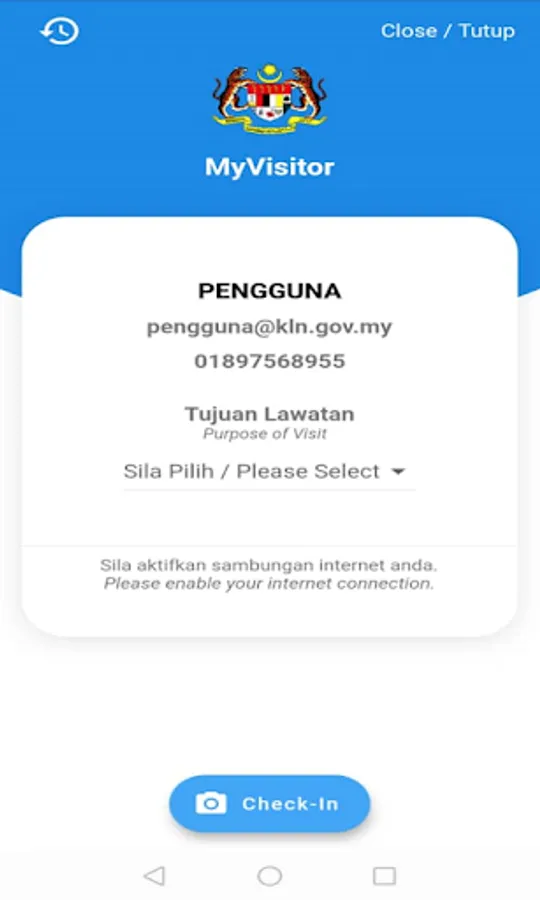 This mobile application is used by visitors to register (check-in) to enter the office of the Ministry of Foreign Affairs located in Precinct 2, Putrajaya. Visitors need to scan the QR code provided at the Guard House and fill in the visit details before being allowed to enter the office area.
