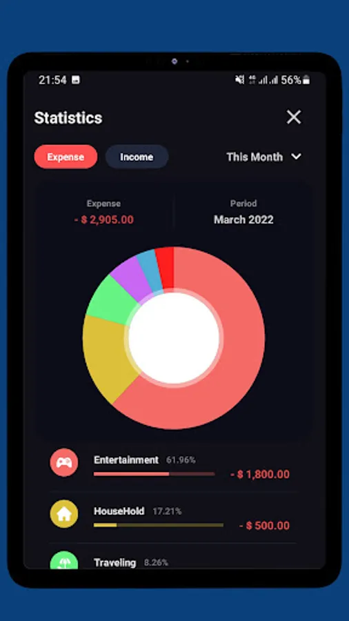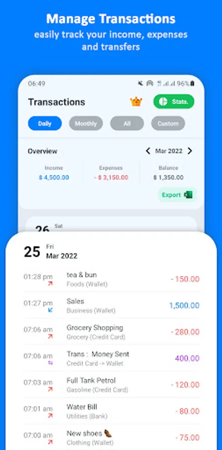 This Money Manager will help you to manage your income, expenses and transfers easily. Also you can analyze them using pie charts. This is a very simple app and very easy to use. This Money Manager only contains essential functions for a regular person to manage their finances.