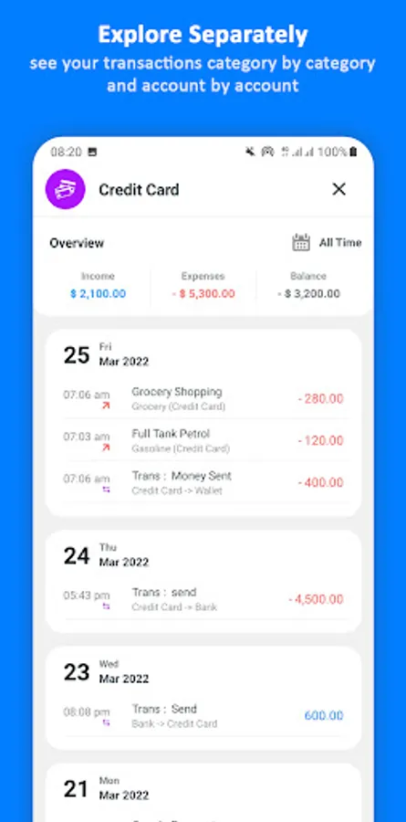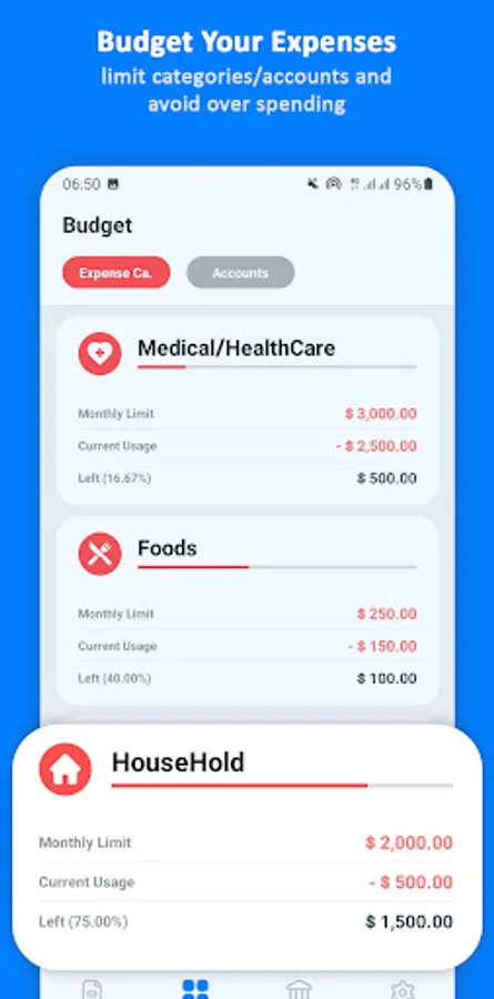 Using this Money Manager you can budget your expense categories and accounts to avoid overspending.