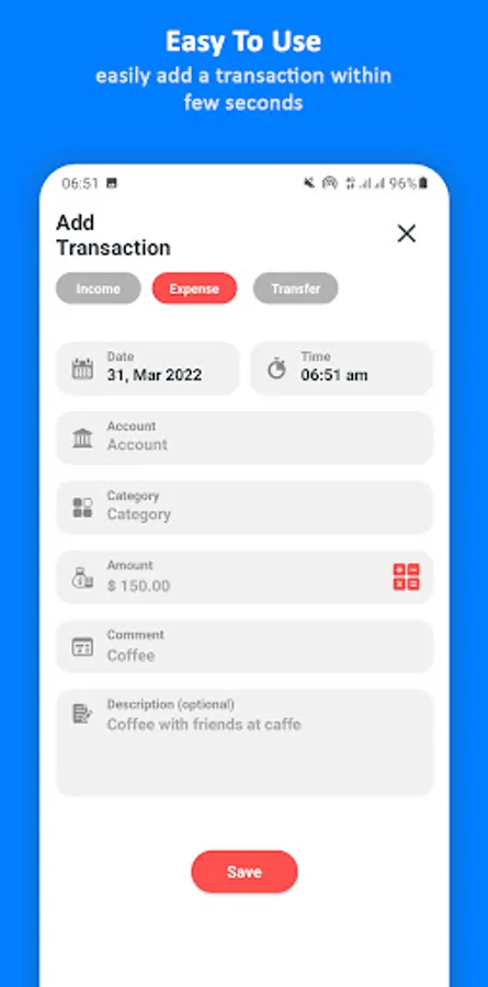 * Record Income, Expense & Transfers in less than 10 seconds.