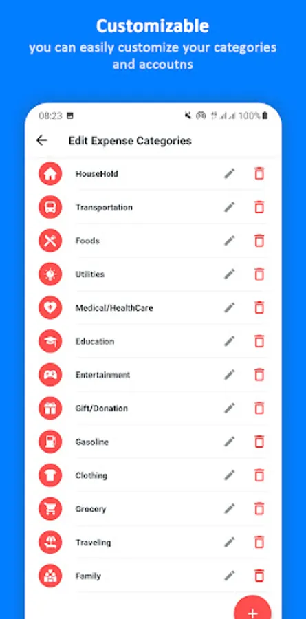 This Expense Tracker allows you to create your own Income Categories, Expense Categories and accounts.