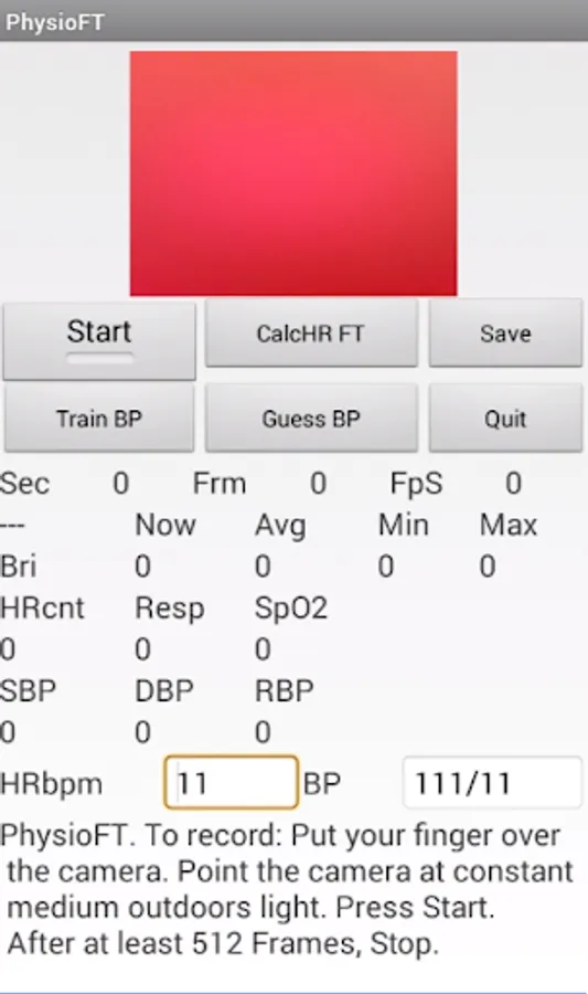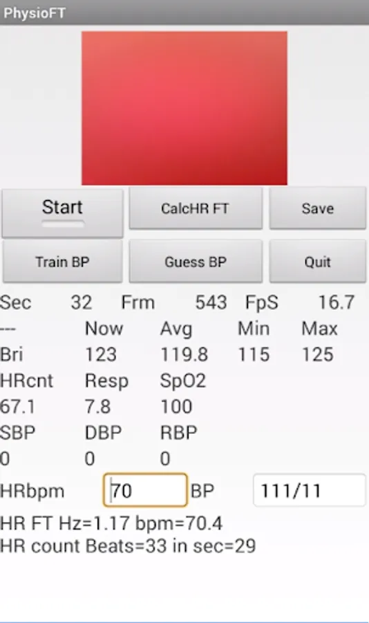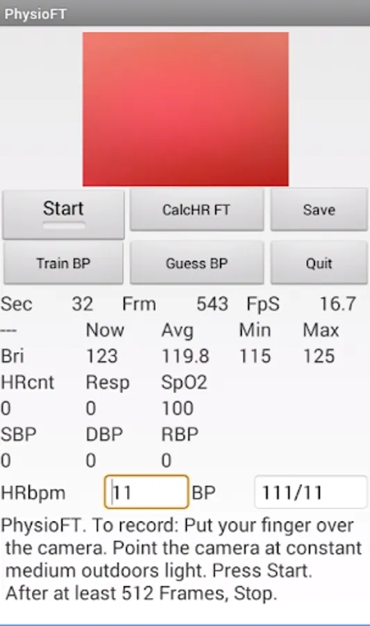 USAGE: 1. To record a PPG the user presses “Start” (Screenshot 1), waits until at least 512 frames have been analyzed, then presses “Stop” (Screenshot 2). For a training sample, the SBP, DBP and HR must be simultaneously recorded with a BP cuff, e.g. with the cuff on the left arm and the phone in the right hand with the right index finger over the camera.