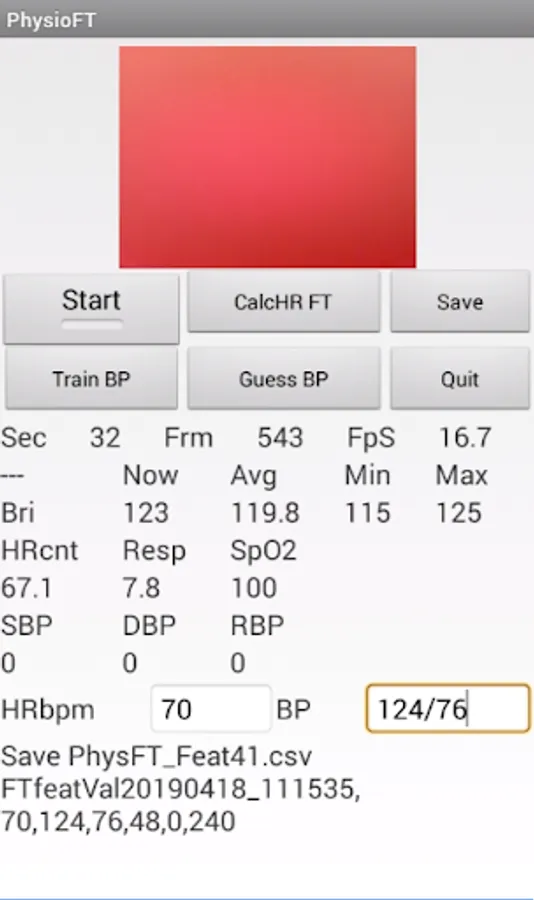 3. The “Save” button (Screenshot 4) saves measured parameters and FFT-derived features to the file “PhysFT_Feat41.csv” in the device “Downloads” folder.