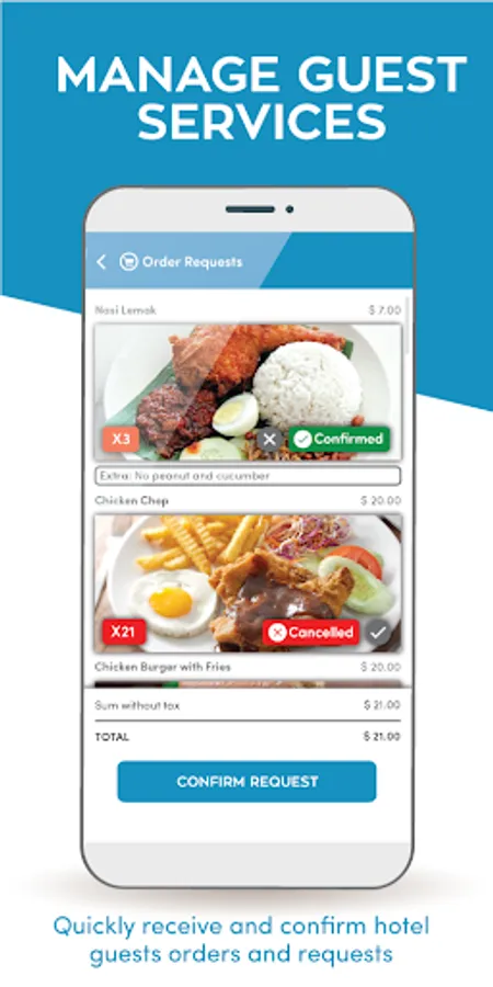 Seamlessly receive and confirm guest orders for room service and other services. You can also view guests that are online, and keep track of their requests and orders.