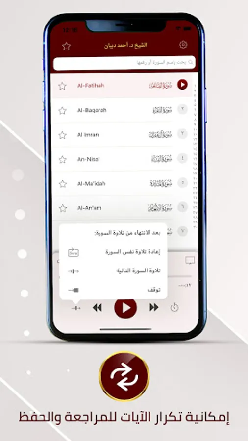- Repeating the recitation of each verse to assist in memorizing and revising the Quran.