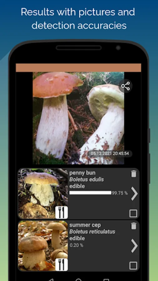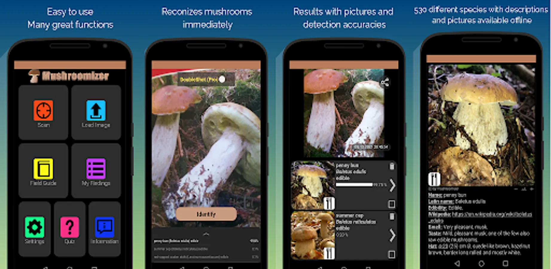Our app features detailed descriptions, pictures, and Wikipedia information for each mushroom species, all available offline. Scan pictures from any source and get accurate identification results, along with a rating of the accuracy.