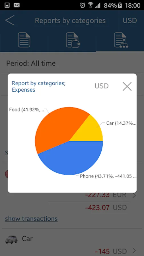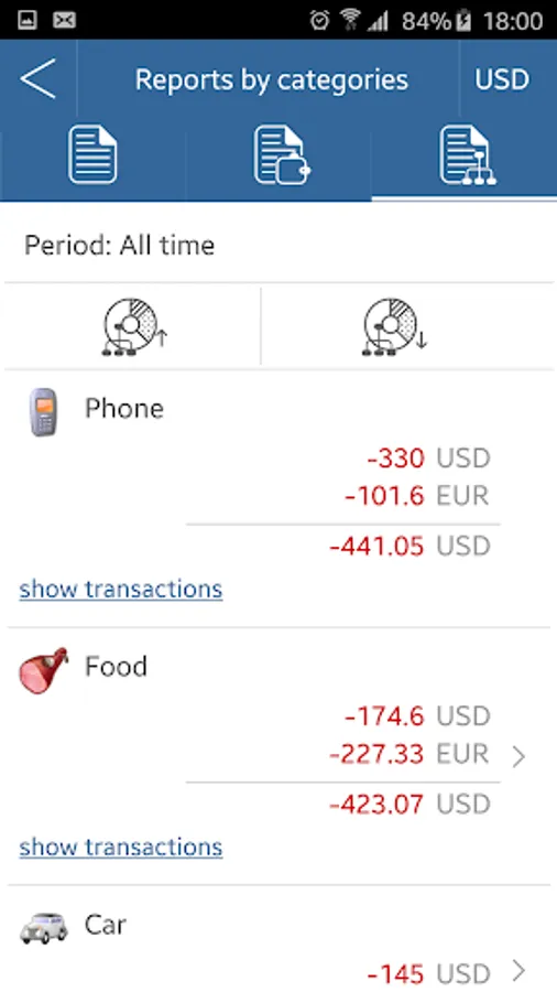 You will always be informed of your financial possibilities. The app will show you, where you can save money and where you can spend more than usual. It is much easier to do this by using categories (food, clothes, car), accounts (cash, bank card, deposit), currencies (dollars, euros, pounds) and transfers (from one account to another).