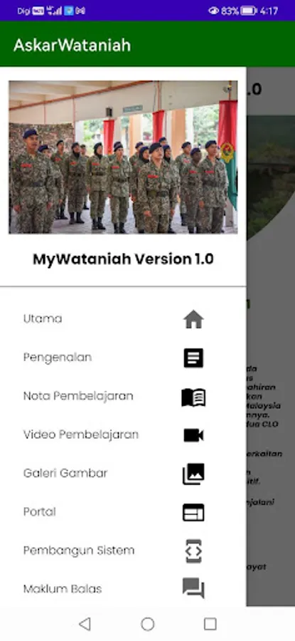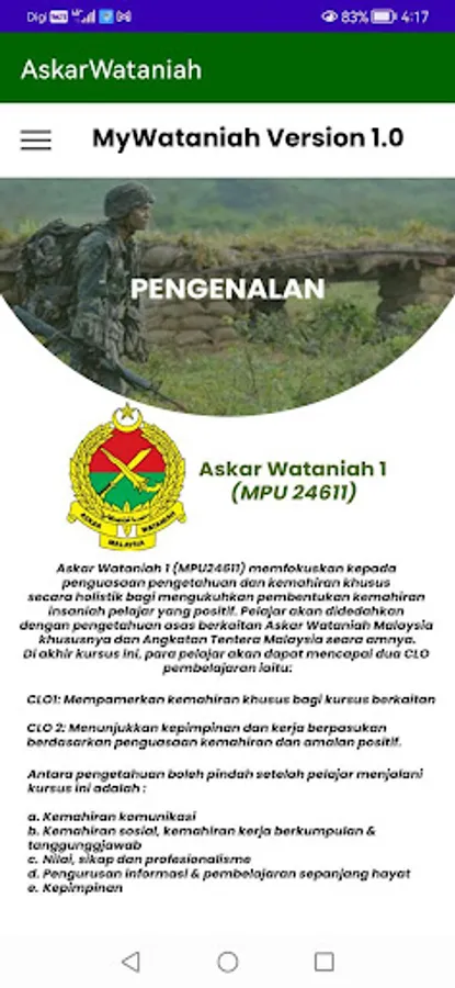 Aplikasi MyWataniah1 dibangunkan sebagai pembaharuan dalam pengajaran dan pembelajaran (PdP) kod kursus MPU24611 bagi kursus Wataniah 1 yang wajib di ambil oleh pelajar semester 1 yang memilih Badan Uniform Askar Wataniah untuk subjek Ko-kurikulum di Politeknik Sultan Abdul Halim Mu’adzam Shah (POLIMAS). Aplikasi ini menyediakan medium PdP tanpa batasan dengan menggunakan telefon pintar (Smart Phone) dimana pelajar dapat mengakses nota-nota pembelajaran daripada bab 1 hingga bab 8, video kawad kaki, gambar-gambar aktiviti tahunan dan link web berkaitan tanpa mengira tempat dan masa.