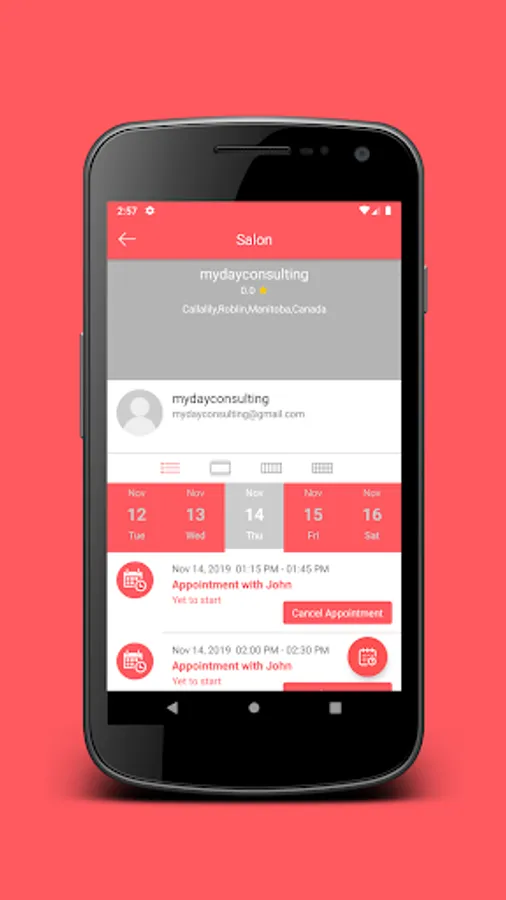 Customers can schedule appointments with service providers using Myday App. Appointments will be available in the calendar view and can be cancelled, if needed. Based on the appointment schedule, service will be provided by service provider and once appointment is complete, service provider can bill the customer. Payment can be done using cash / credit card / debit card /Pay pal