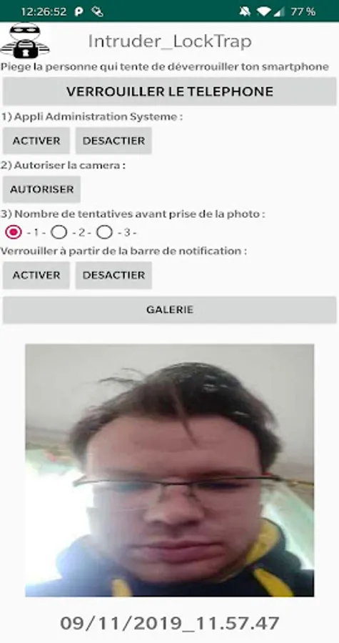 This program performs a screen lock and can take a picture of anyone who is wrong in unlocking the smartphone. The picture is taken by the front camera of the phone when the user enters a wrong code.