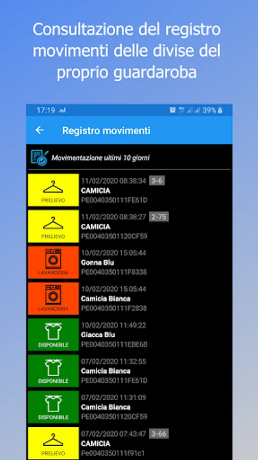 Each uniform is equipped with a RFiD TAG which guarantees complete logistic traceability, from delivery in special dirt collection dispensers positioned inside the structures, to the passage in the laundry until the return to the structure on special automatic redelivery machines where required.