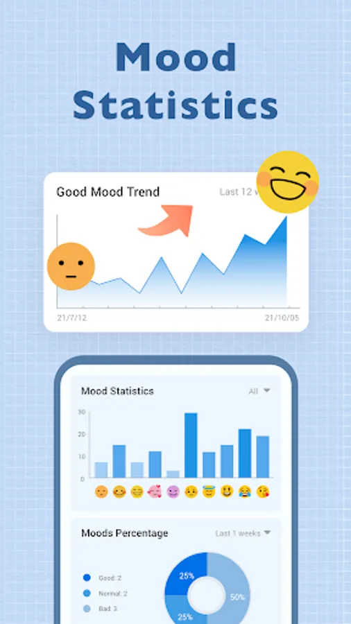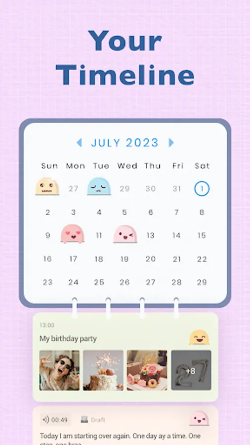 Some moods are hard to describe with words in a diary, then you can choose mood diary symbols. Add your diary mood when you start writing private journals, and you can review your mood changes through the calendar. We wish you feel happy in your daily diary. Actually, keeping daily journals can also be a kind of joy.