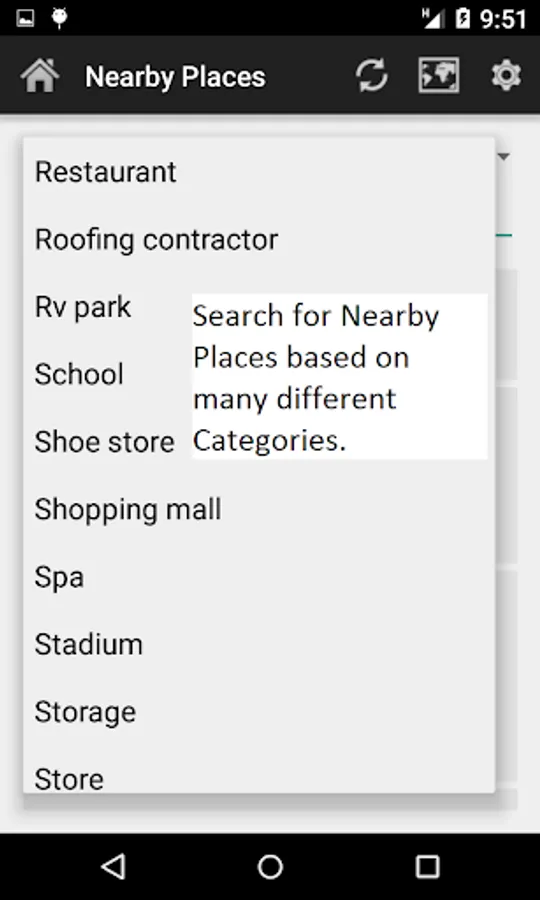 Find nearby places within a certain radius. To route to that place , or view reviews touch on the place row. View all the nearby places on a Map.