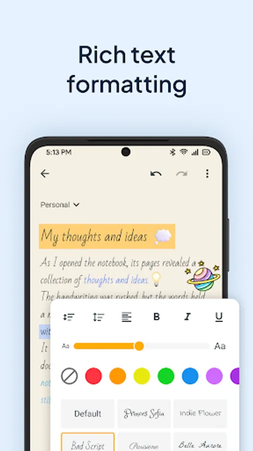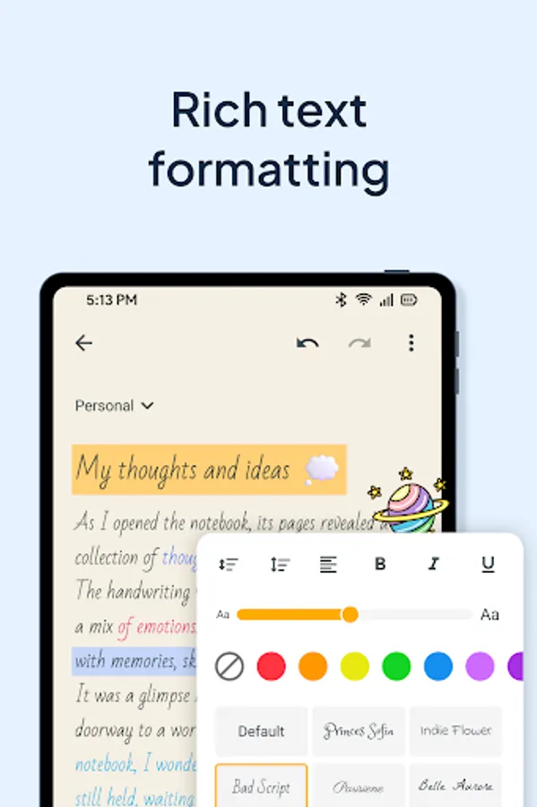 Enhance your notebook with rich text formatting options, including bold, italic, underline, and bullet points.