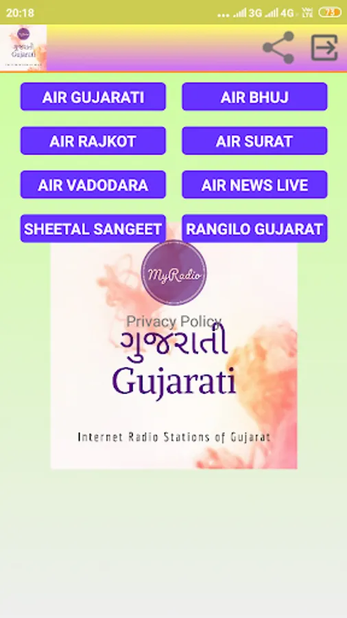 Listen to some fine Internet Radio Stations of Gujarat such as : AIR Gujarati, AIR Rajkot, AIR Surat, AIR Vadodara, AIR Bhuj, Sheetal Sangeet etc.