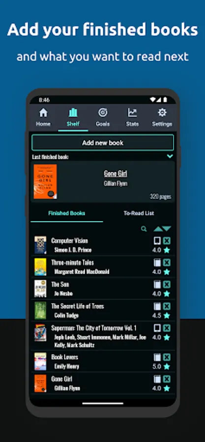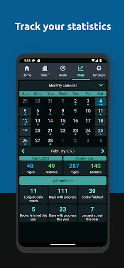 My Reading Record is a reading tracker app designed to help you track and catalog your current and past books, eBooks and audio-books. You can add books to your personal to-read list, create custom reading goals and check the charts to see how you've been doing!