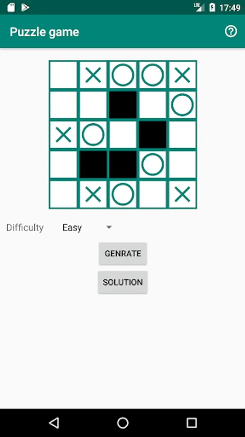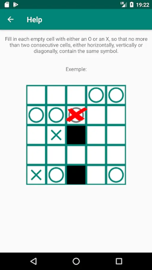 This logic puzzle game objective is to fill each cell with an X or 0 so that, no more than two consecutive cells contains the same symbol.