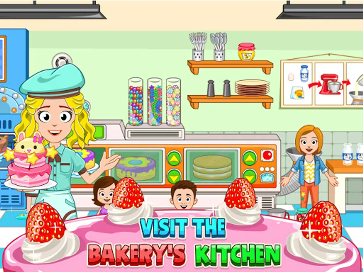 The My Town : Bakery - Baking Game for Kids has SEVEN new locations to explore! There is the bakery, a pizza shop, a park for outdoor birthday parties and even an own apartment for you! No matter where you choose to start your dollhouse adventure, there are HOURS of baking fun ahead!