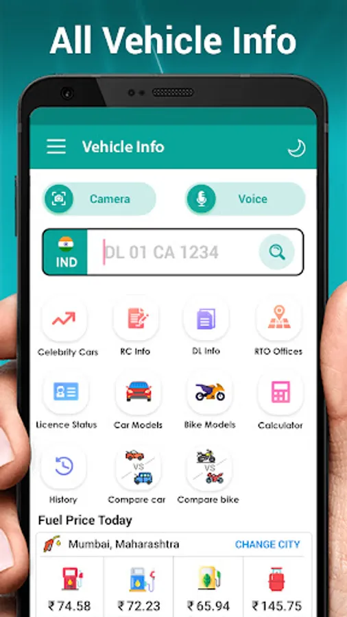 ✓ Camera live number plate scanner and Voice Search of vehicle registration details.