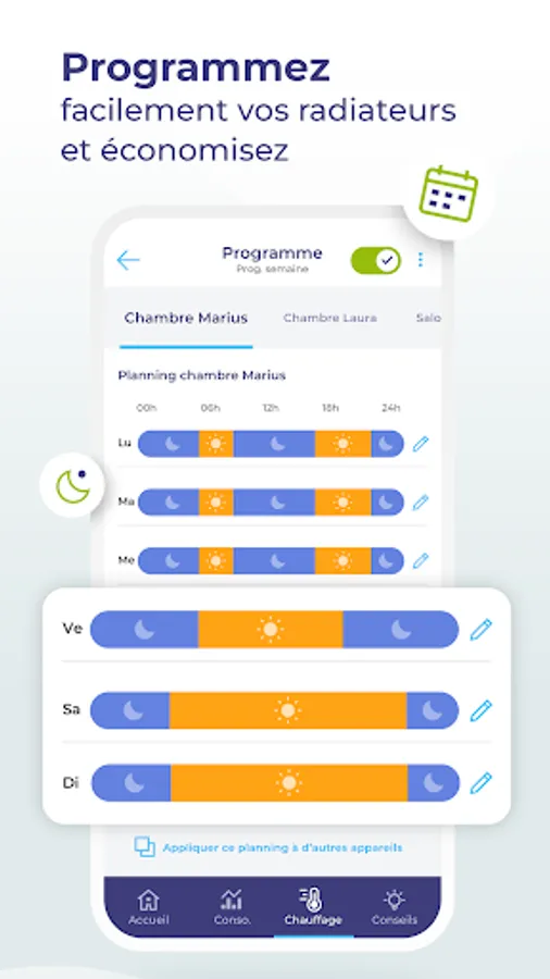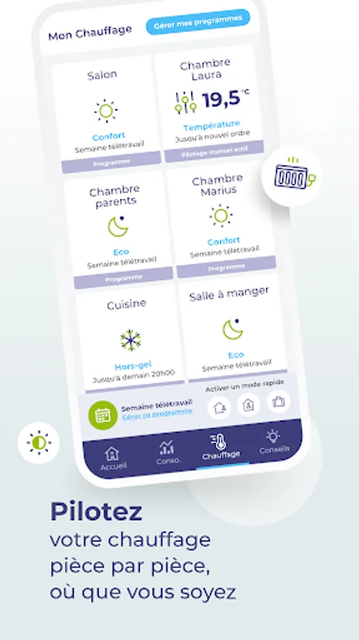 • Room-by-room programming makes it easy to create a schedule for each moment of life: day / night, working week (absence from the accommodation during the day), telework (presence in the accommodation), weekends, etc.