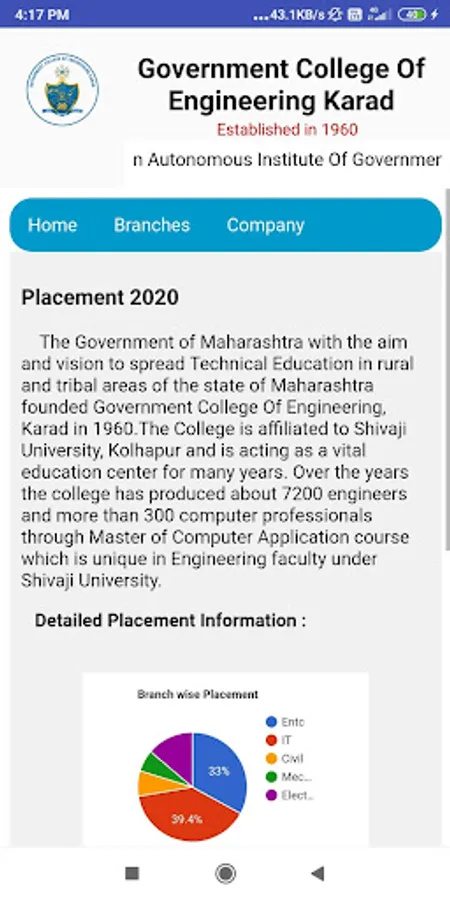 The Government of Maharashtra with the aim and vision to spread Technical Education in rural and tribal areas of the state of Maharashtra founded Government College Of Engineering, Karad in 1960.The College is affiliated to Shivaji University, Kolhapur and is acting as a vital education center for many years. Over the years the college has produced about 7200 engineers and more than 300 computer professionals through Master of Computer Application course which is unique in Engineering faculty under Shivaji University. Along with the degree courses in Civil,Machanical, Electrical and Information Technology, the college also offers PG programs in different specializations in Civil, Mechanical and Electrical Engineering. Vision of the Institute "To emerge as a Technical- Institution of National repute driven by excellence in imparting value based education and innovation in research, to face the global needs of the profession."