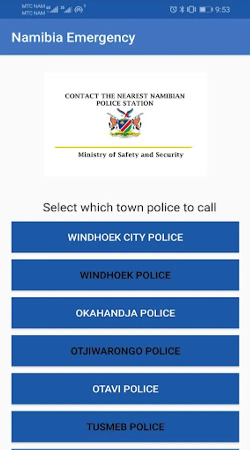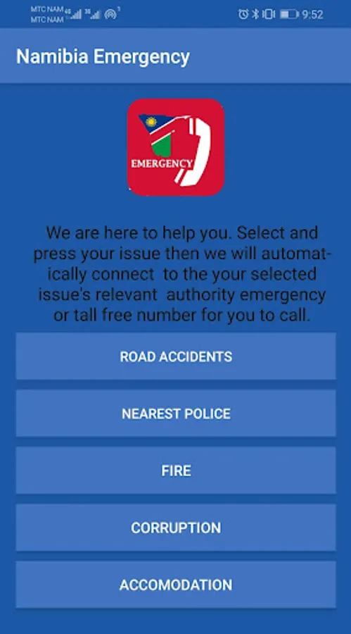 Call all emergency services in a faster way. This App is an offline App (it does not requires internet to work in your phone). It contain a buttons that will automatically call any emergency number you may be interested to call such as during accidents. We have numbers such as for MVI fund, Windhoek City Police, All police stations' number in Namibia, fire brigade stations and many more. Having this app installed in your phone means you are ready to call relevant authorities during bad times.