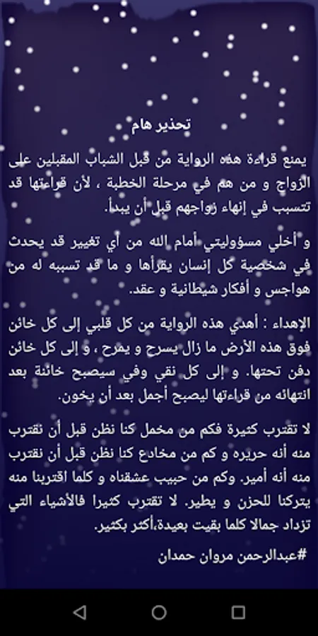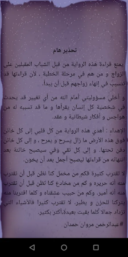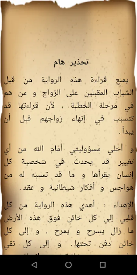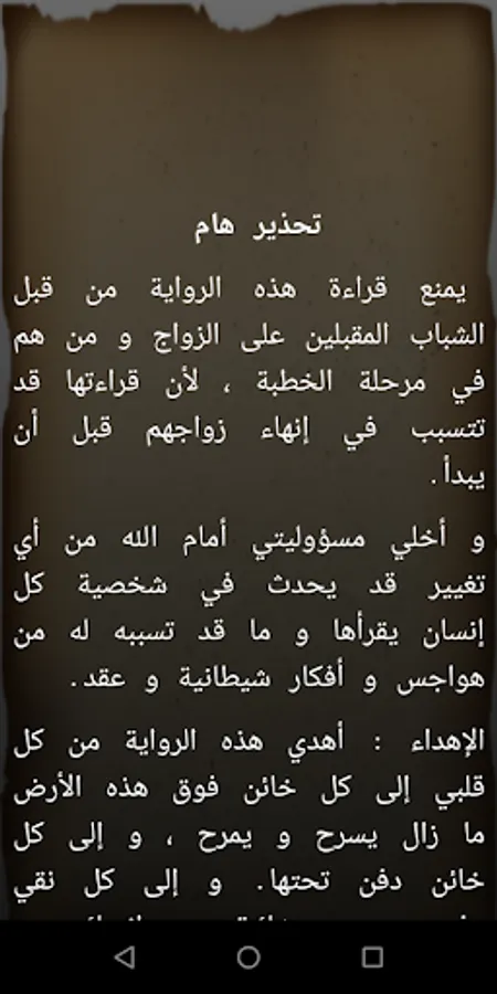 It is forbidden to read this novel by young people who are about to get married and those who are in the engagement stage, because reading it may cause their marriage to end before it begins.