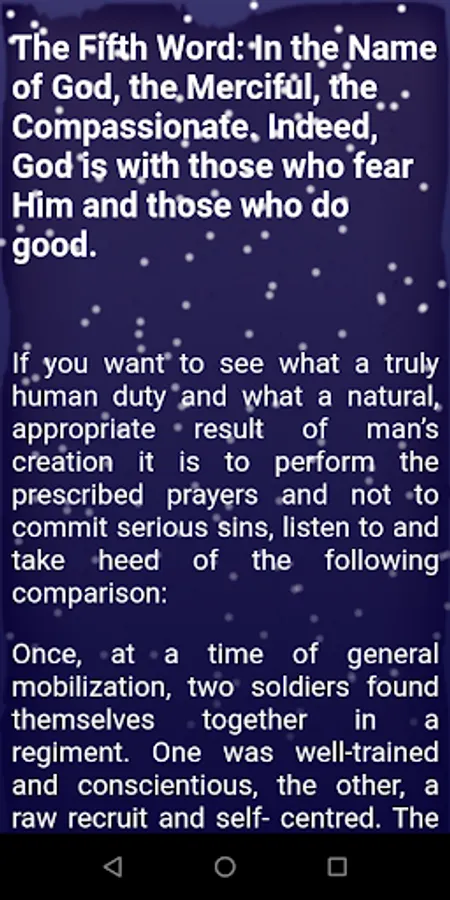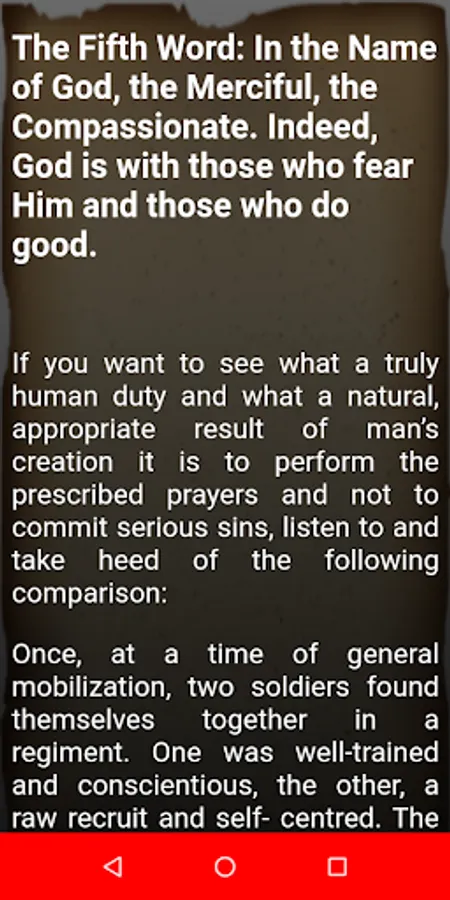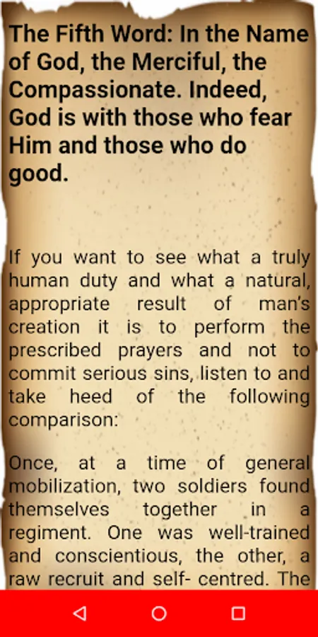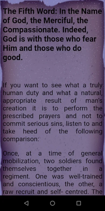 [Brother! You wanted a few words of advice from me, so listen to a few truths included in eight short stories, which since you are a soldier, are in the form of comparisons of a military nature. I consider my own soul to need advice more than anyone, and at one time I addressed my soul at some length with Eight Words inspired by eight verses of the Qur’an from which I had benefited. Now I shall address my soul with these same Words, but briefly and in the language of ordinary people. Whoever wishes may listen together with me.