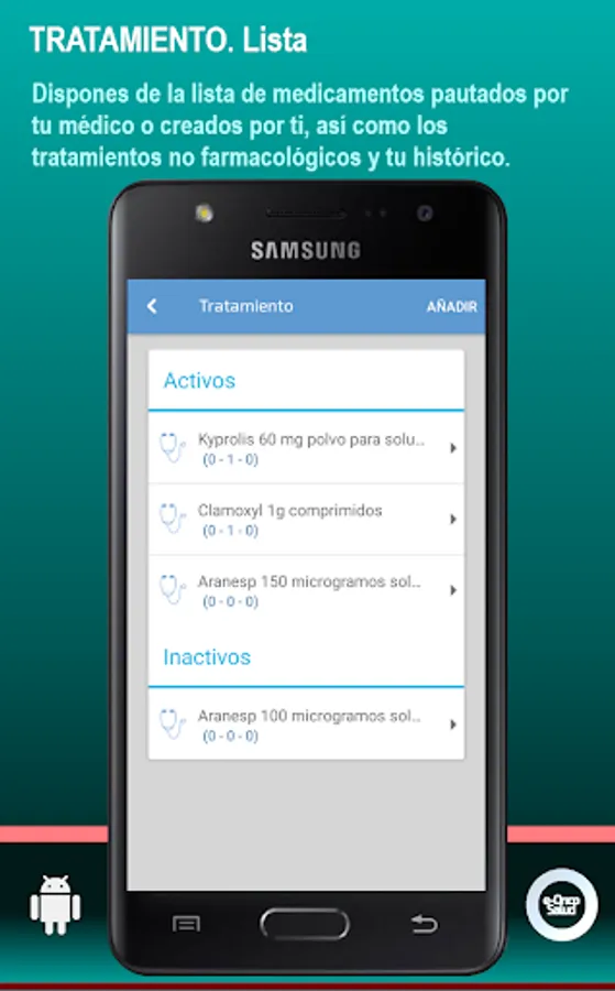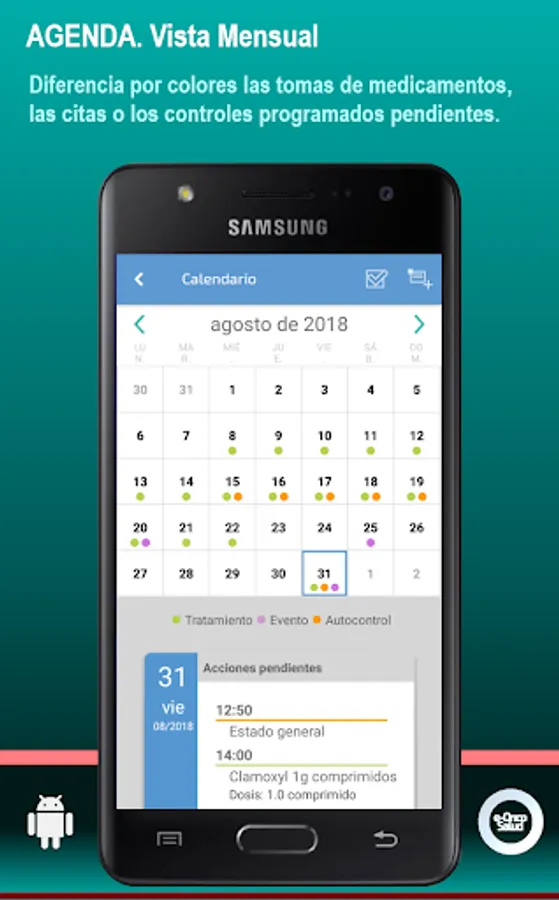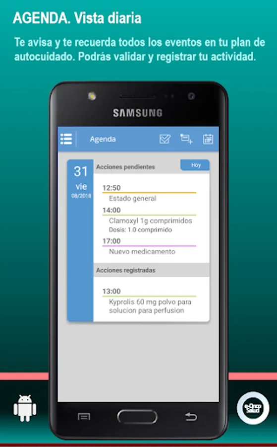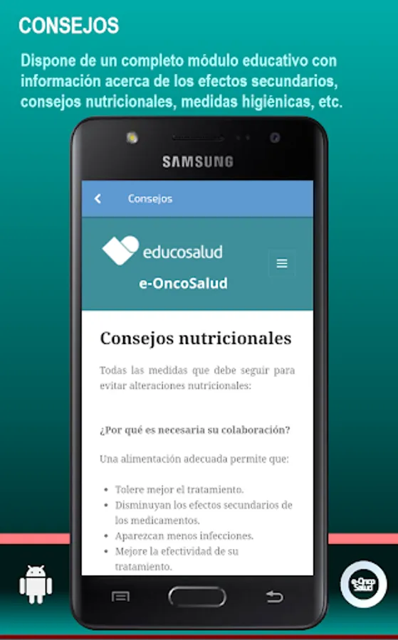 TREATMENT: eOncoSalud is a tool to help you manage your pharmacological treatment, allowing you to plan and validate the taking of drugs at all times. From the application you can also add other drugs and treatments. It contains information, photographs, leaflets and recommendations on drug treatment, as well as precautions to take and information on possible interactions.