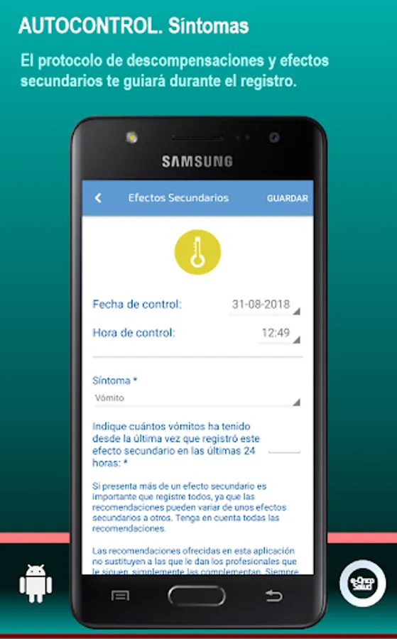 SYMPTOMS and ADVERSE EFFECTS. The patient has a specific protocol for action in the event of symptoms or decompensations. Once an adverse effect is registered, eOncoSalud will ask and guide you based on your responses. It allows inserting images and multimedia files, especially interesting in skin alterations.