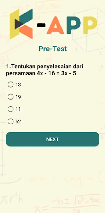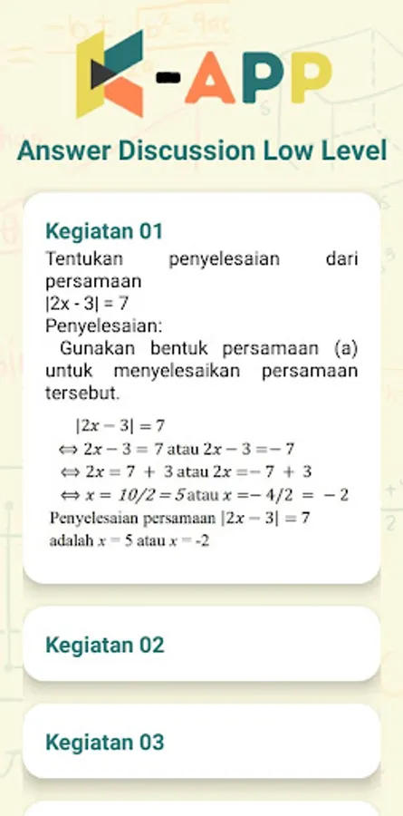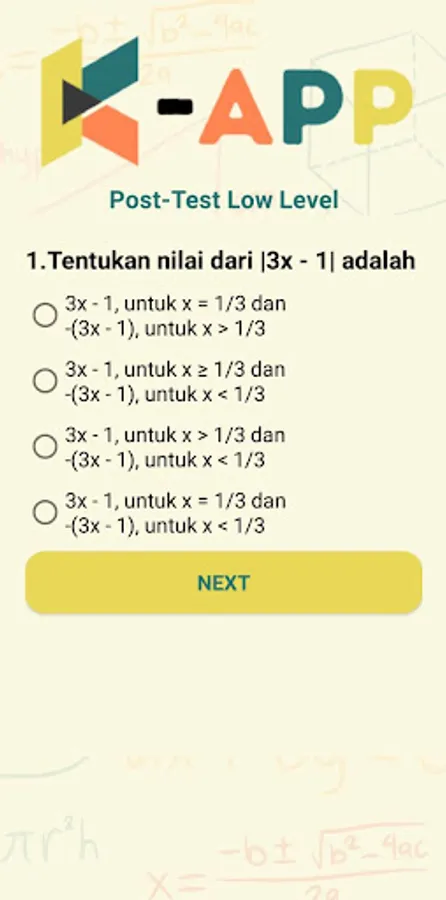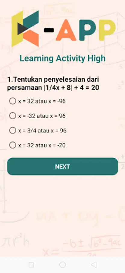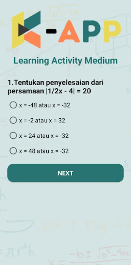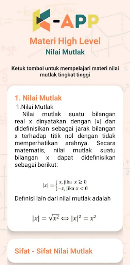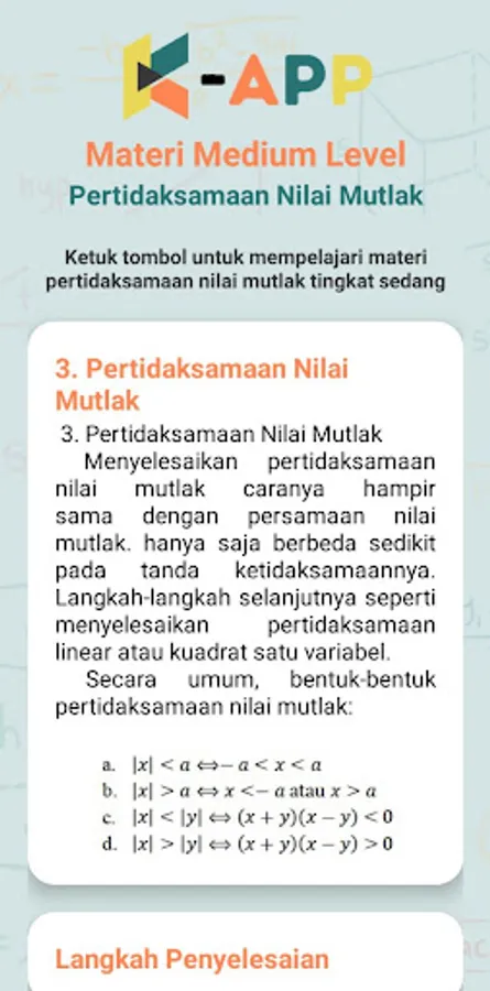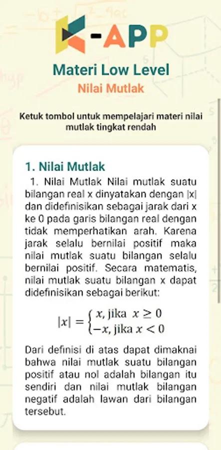 K-App is an android application that applies the Differentiated Instruction method. contains a calculus 1 learning module on absolute value equation material, which was compiled by a lecturer in the Calculus 1 course in the Informatics Engineering Study Program, Darussalam Gontor University, Al-Ustadzah Triana Harmini, M.Pd.