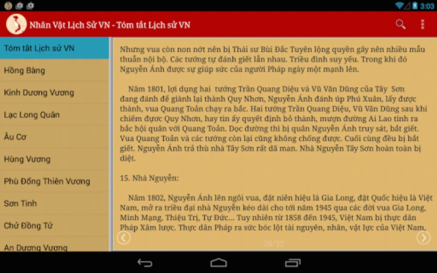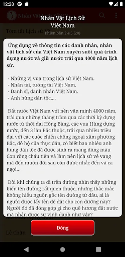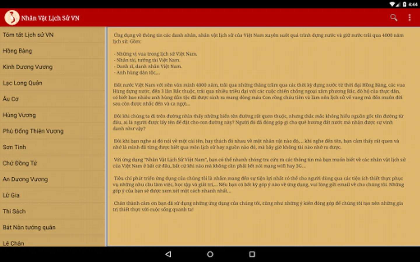 With the application "Vietnamese Historical Characters", you can quickly look up information you want to know about Vietnam's historical figures anywhere, anytime without having to link. say wifi or 3G network ...