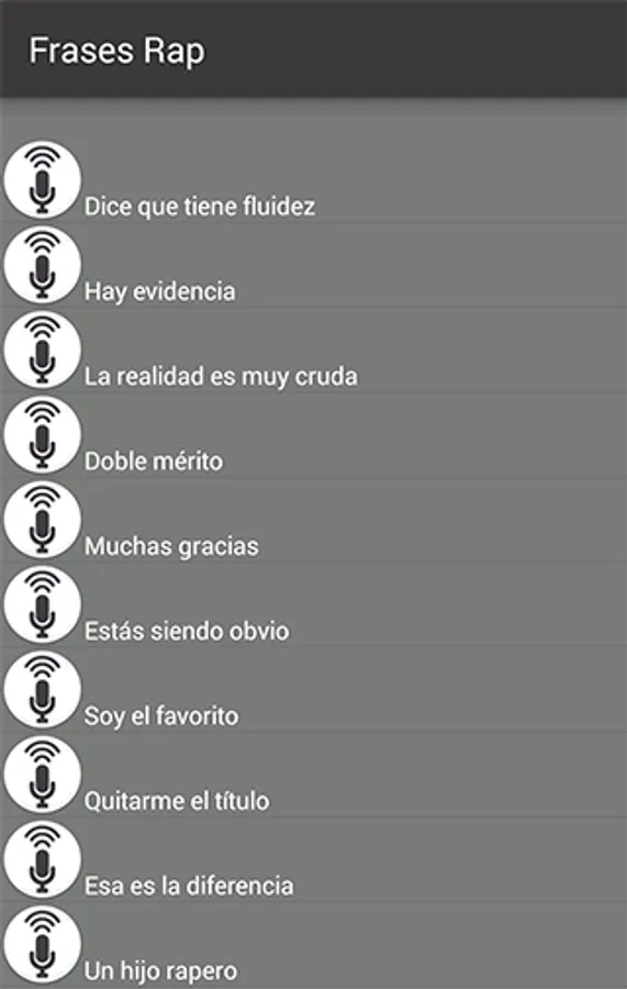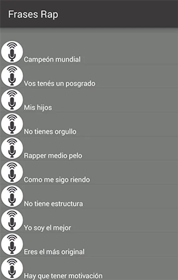 This application includes rhymes, verses, phrases, songs and freestyle urban rap and hip hop music from various battles of cocks; to listen anytime, anywhere, with good audio and sound quality, without the need for an internet connection; and each of which you can play, stop and play again whenever you want. Also, if you wish, you can return to the main menu at any time.